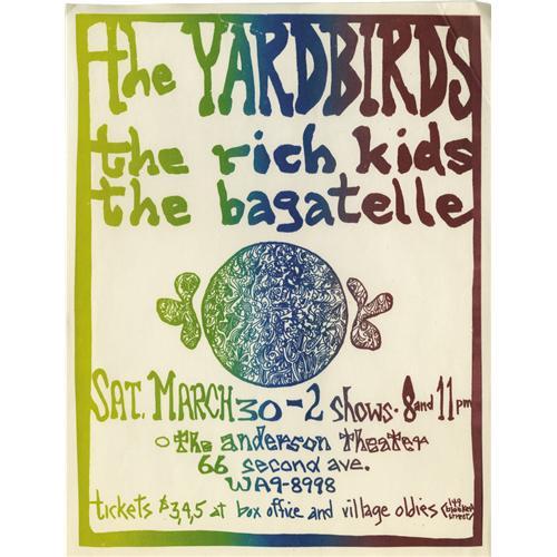 <B>Yardbirds Anderson Theater Concert Handbill (1968).</B></I> Here's a rare handbill for one of those magical shows everyone wishes they could have attended. The Yardbirds were once one of England's most popular rock bands of the 1960s; superstars Eric Clapton and Jeff Beck had each once been lead guitarist for this mighty band, but had both moved on to other projects by the time of these historic, March 30, 1968 shows. Expectations weren't very high, as new guitar slinger Jimmy Page was barely known by most Americans, and rumors were already circulating about the band's demise (which was true -- later that year, Page recruited new members, and renamed the band Led Zeppelin). Recording equipment was set up for two shows at New York's Anderson Theater, and the results were a blistering Yardbirds show, in which Page seemed at times to be possessed as he soloed. The tapes were used for a limited edition album by the band's American label, Epic; it's now considered the toughest Yardbirds record to find, in any condition. This attractive handbill was printed in a "split-fountain" technique on cream-colored bond, and is in NM- condition, with a light crease in the upper right corner.<BR><BR><b>Shipping:</b> Flat Material, Small (<a target="_blank" href="http://www.heritageauctions.com/common/shipping.php">view shipping information</a>)