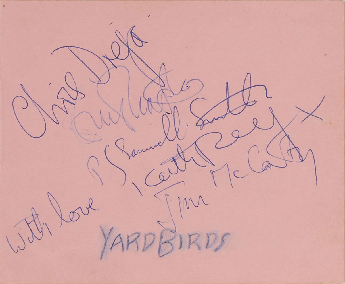 Vintage ballpoint signatures of Chris Dreja, Jim McCarty, Eric Clapton, Paul Samwell-Smith, and Keith Relf, with one adding “with love,” on a pink 6 x 5 album page. In fine condition, with a collector’s notation along bottom.