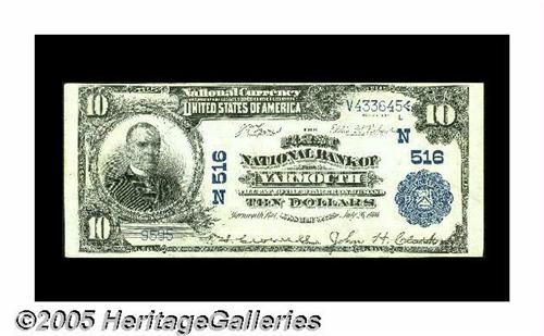 <B>Yarmouth, MA</B></I> - $10 1902 Plain Back Fr. 624 <B>The First NB</B></I> Ch. # (N)516<BR>A broadly margined specimen with bright white paper and a vivid blue overprint. This is only the second $10 Third Charter example reported from the bank, and it's a note any collector would be delighted to own. <B>Very Fine-Extremely Fine.</B></I>