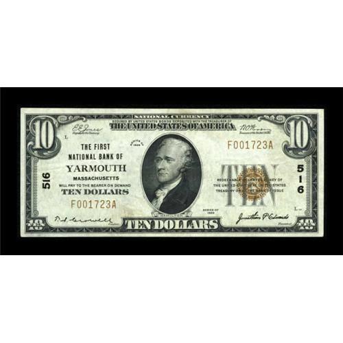 <B>Yarmouth, MA</B></I> - $10 1929 Ty. 1 <B>The First NB</B></I> Ch. # 516<BR> Series 1929 examples are considerably scarcer from here than are large and this is the highest grade small note we have seen from here in years. Nice <B>Extremely Fine-About Uncirculated.</B></I><BR><BR><b>Shipping:</b> Coins & Currency (<a target="_blank" href="http://www.heritageauctions.com/common/shipping.php">view shipping information</a>)