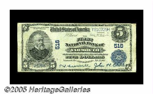 <B>Yarmouth, MA</B></I> - $5 1902 Plain Back Fr. 598 <B>The First NB</B></I> Ch. # 516<BR>A nice evenly circulated example from this always in demand bank. <B>Fine-Very Fine,</B></I> with bold blue signatures of T.S. Crowell and John H. Clark.