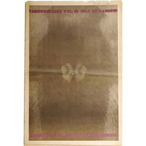 <B>Yarrowstalks #1 R. Crumb (Brian Zahn, 1967) Condition: VG.</B></I> This item is something of a "holy grail" among R. Crumb collectors, due to the inclusion of Robert's earliest comic strips starring his famous "Mr. Natural" character. Basically a "hippie newspaper", Yarrowstalks was the brainchild of Philadelphia publisher Brian Zahn, who signed this copy in the upper right margin. Unlike the white-paper copy that sold in our last auction (at $567.63 for a FN copy), this one is printed on newsprint; however, both copies originated from the same collection. Crumb would continue to contribute strips to this and other similar papers (like New York's East Village Other), before turning his attention on his first solo comic, Zap Comix #1. No certificate of authenticity accompanies the autograph. Fogel's Underground Comix Price Guide GD 2.0 value = $20; FN 6.0 value = $60. Key words: R. Crumb, Robert Crumb, Underground Comix.<BR><BR><b>Shipping:</b> Large Flat (<a target="_blank" href="http://www.heritageauctions.com/common/shipping.php">view shipping information</a>)