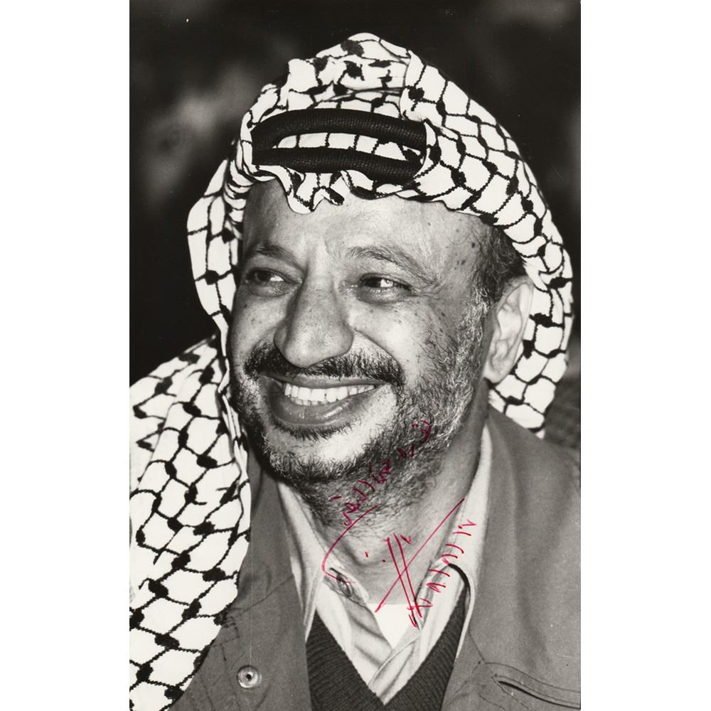Vintage glossy 4.5 x 7 close-up photo of the Palestinian leader, signed in red ballpoint. In fine condition, with a thin crease across the top and light overall surface spotting.