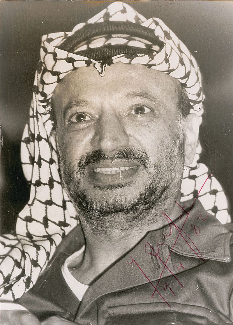 Glossy 5 x 7 photo of Arafat wearing his trademark keffiyeh, signed in red ballpoint, “Y. Arafat, 9-4-82.” In fine condition, with scattered creases. Accompanied by the original transmittal letter from the chairman’s office of the Palestine Liberation Organization.