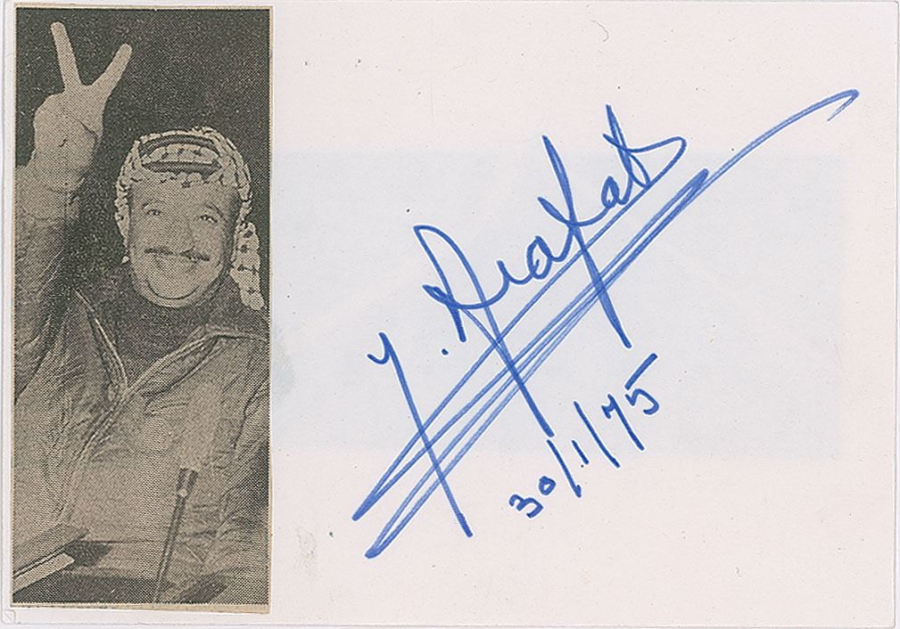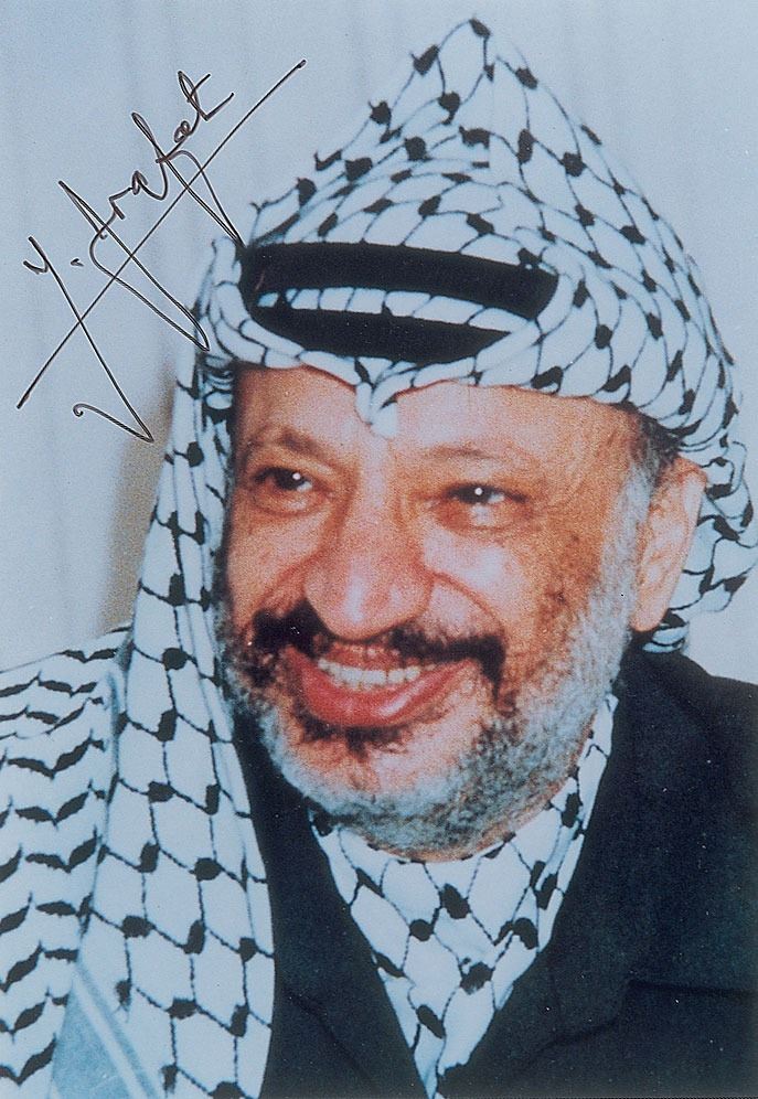Two items: a color glossy 4 x 6 photo, signed in black felt tip, "Y. Arafat"; and a felt tip signature, "Y. Arafat, 30/1/75," on a white 6 x 4 card bearing an affixed newspaper image. In overall very fine condition.