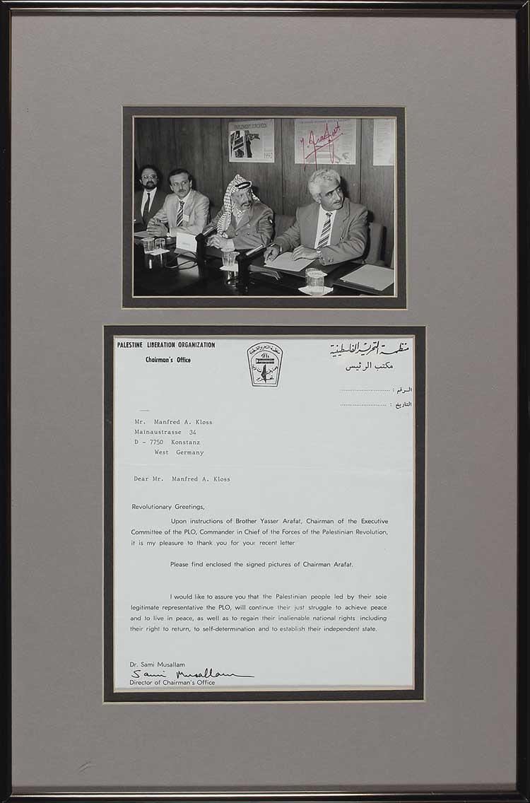 Glossy 6.5 x 4.5 photo of Arafat seated at a conference table, signed in red felt tip, “Y. Arafat.” Double matted and framed with a TLS from the Director of Arafat’s office acknowledging the photo, to an overall size of 13.25 x 20. In fine condition. RRAuction COA.
