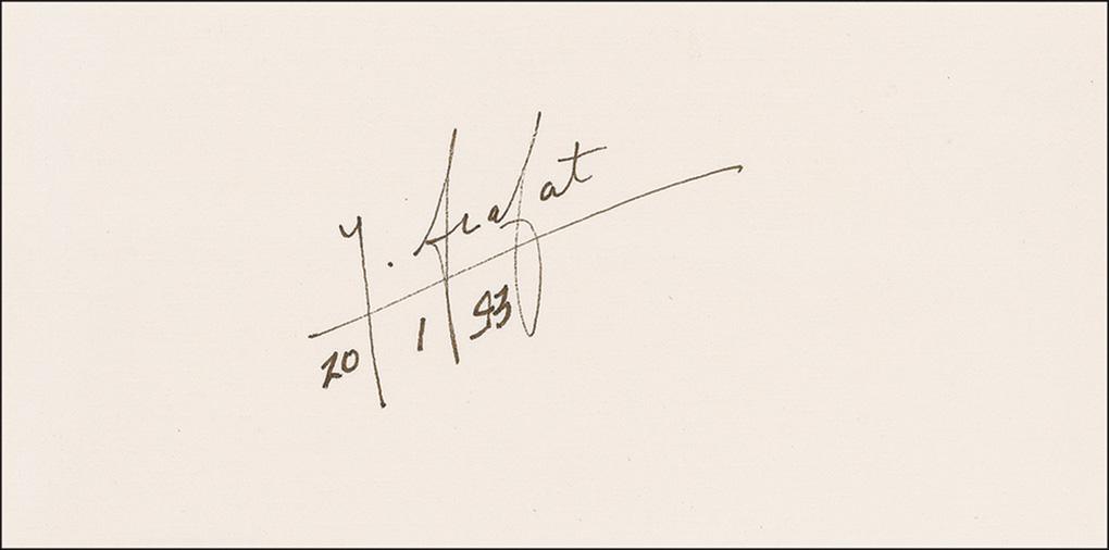 Perfect felt tip signature, “Y. Arafat 20/1/93,” on a 5.75 x 3 card. In very fine condition.