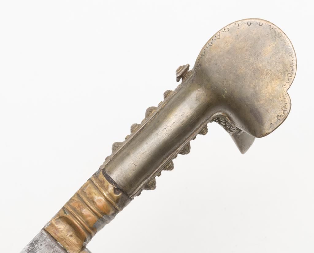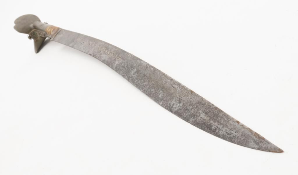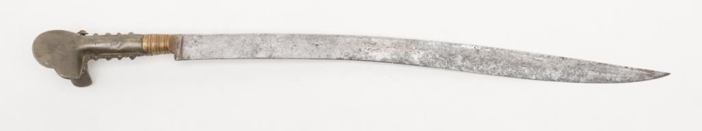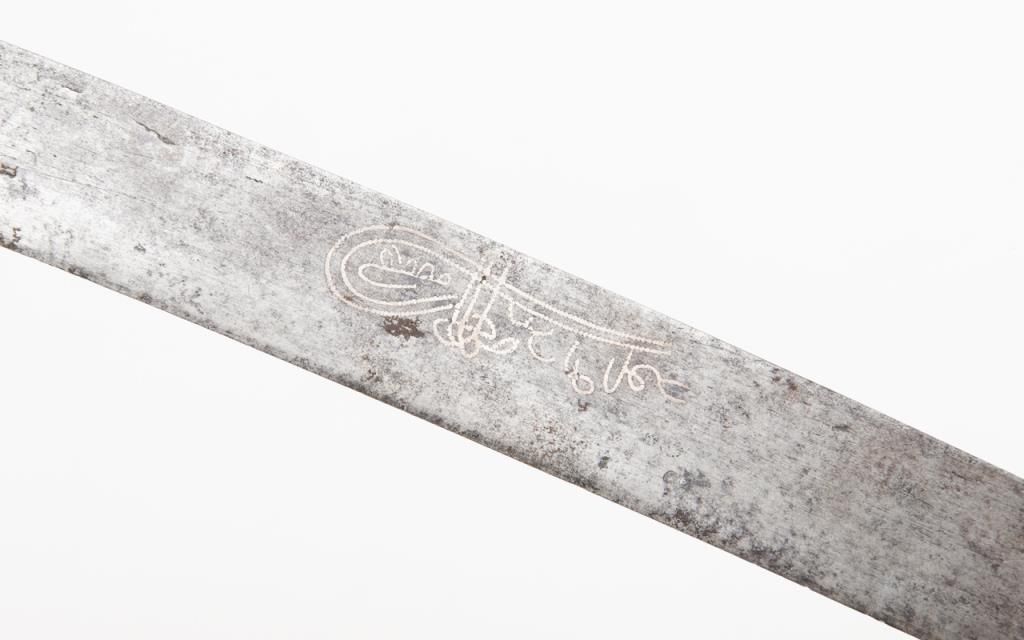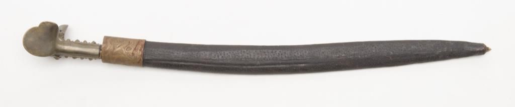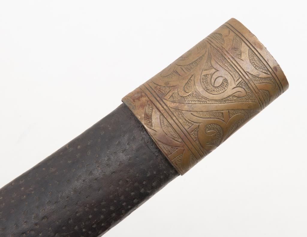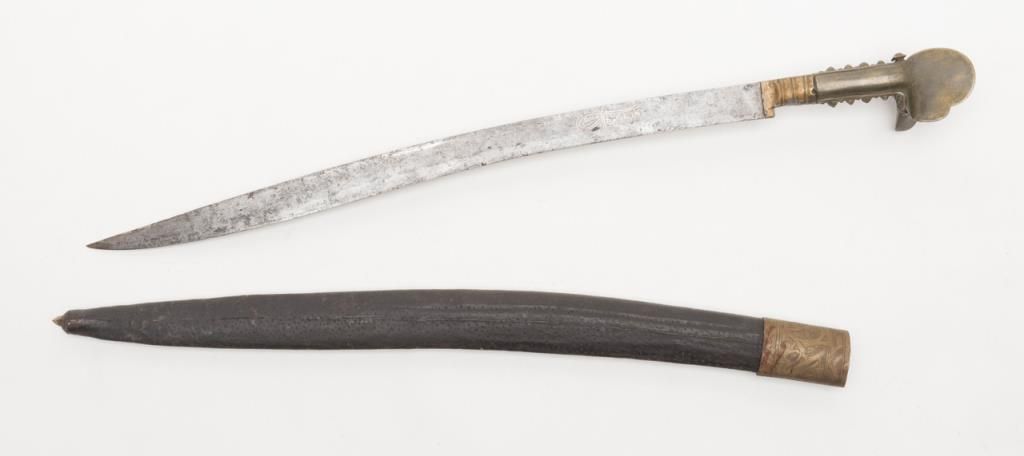 Yatagan sword and leather covered scabbard with brass throat in overall good condition showing a blade with inlaid design work on both sides, cast brass grip with beautiful patina and very good scabbard. Est.: $350-$700.