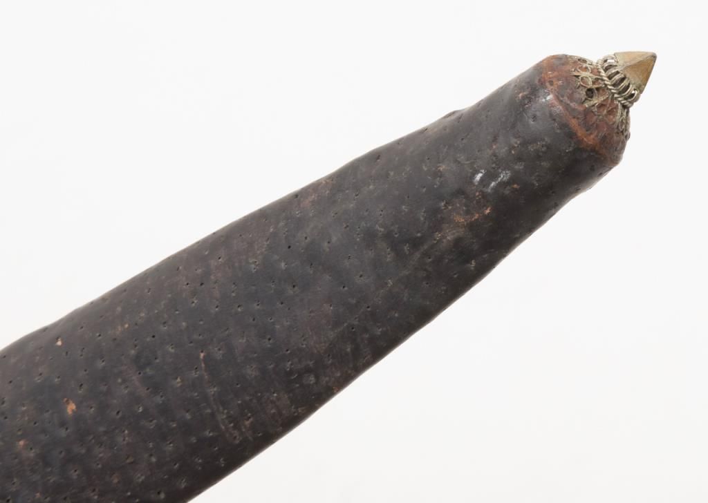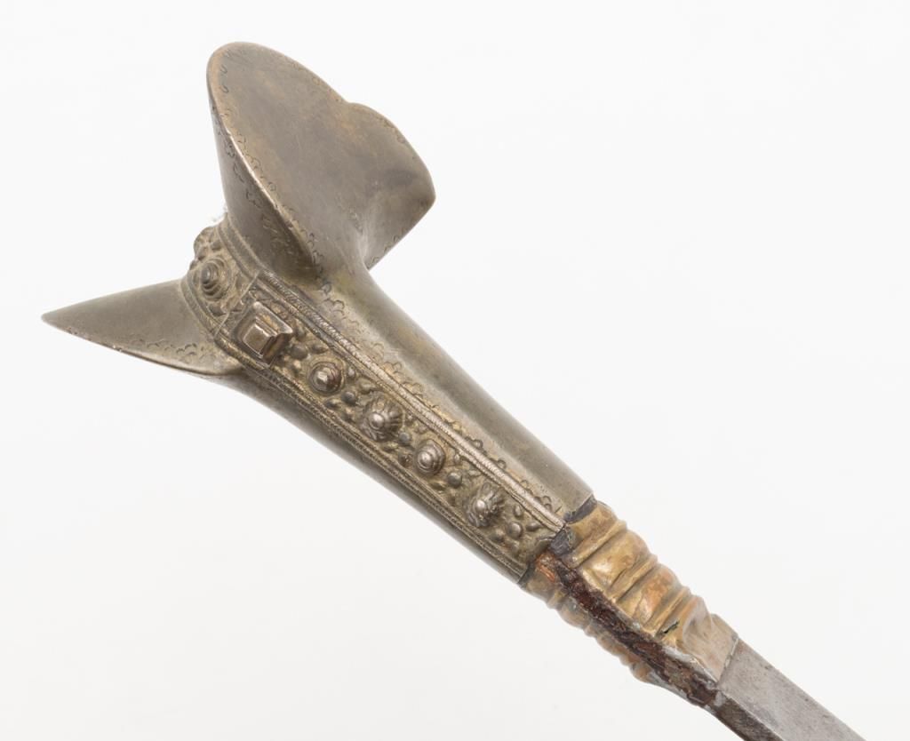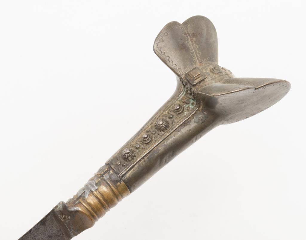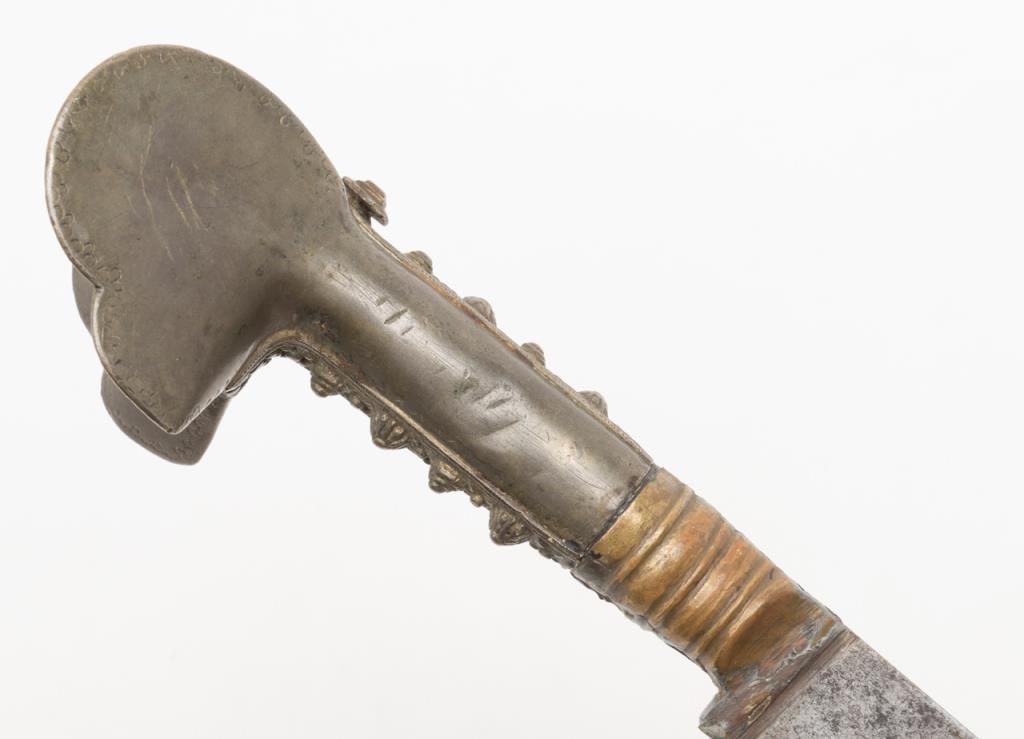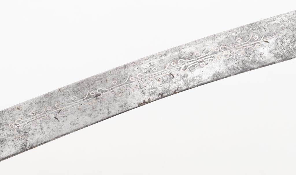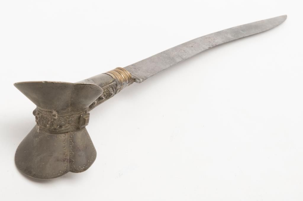 Yatagan sword and leather covered scabbard with brass throat in overall good condition showing a blade with inlaid design work on both sides, cast brass grip with beautiful patina and very good scabbard. Est.: $350-$700.