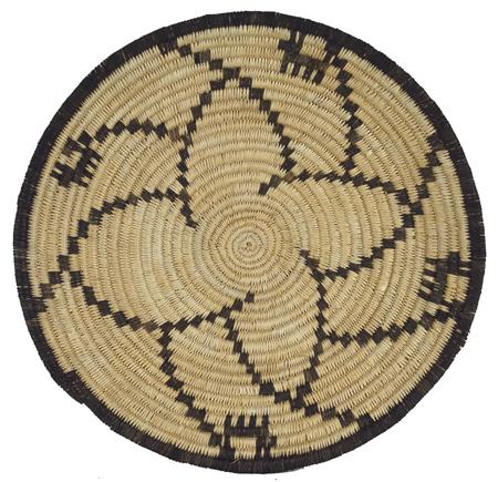 Circa 1950, Great basketry tray with devil's claw floral design containing dogs. 14"