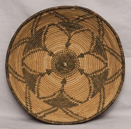 Yavapai Basketry Tray. 3" x 13". With stars and arrows. c. 1900. Fine condition. (est $1,500-2,000).