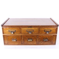 Available for your bidding pleasure is this very fine "Y & E" - Yawman and Erbe Quarter Sawn Oak, stacking filing cabinet. Yawman and Erbe Manufacturing Company was based out of Rochester, New York. This piece displays a wonderful quarter sawn Oak construction with each drawer featuring an elegant brass hardware, with a three drawer note card filing system as well as a three drawer binder filing system. This piece shows excellent condition and measures 33" wide by 18" deep and 14" tall.