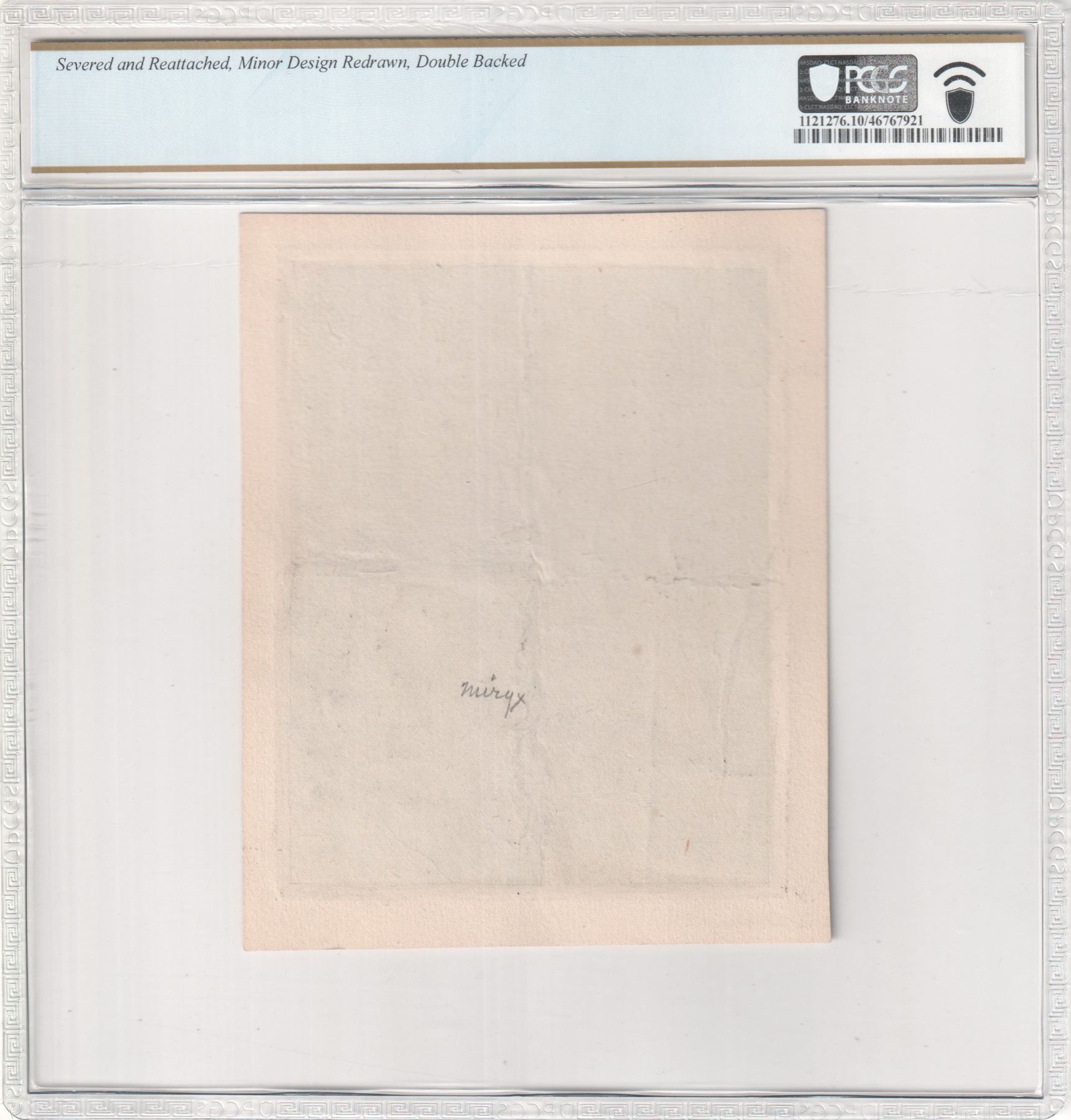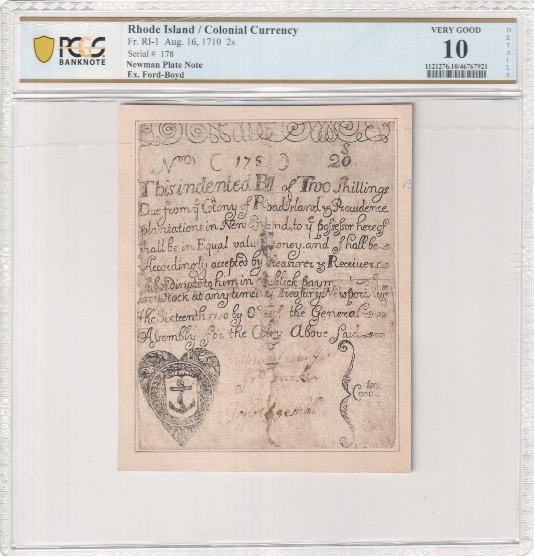 Description: Quaint “Rhoad” Island spelling. Apparently laid paper. Serial No. 178. Signed by Nathaniel Sheffield, Job Greene, and John Coggeshall. Printer uncertain. Uniface, backed as when first offered in Ford. 105mm by 130mm. The present writer has been treated time and time again to great colonial notes while penning these words. Holding and describing this note takes the pleasure of writing to a new level. History in the hand never ceases to amaze some people, the writer included, and this is certainly an amazing note! The Newman Plate Note, still appearing virtually as it did in the Ford sale. The “S 2” denomination of the original note has been “raised” to “S 20,” but there was no space to alter the written denomination, “Two,” in the text. The PCGS qualifiers simply state what was visible in the Ford photos. “This is truly one of the most important notes in the Ford-Boyd Colonial note holding,” wrote that cataloger. The beneficiary of enthusiastic bidding in the Ford sale, this “Rhoad” Island rarity realized well into five-figures. We have every reason to believe it will do the same during this once-in-a-generation opportunity. The present note would be a singular focal point in any colonial paper money cabinet, and the star of the show in an advanced Rhode Island paper collection.