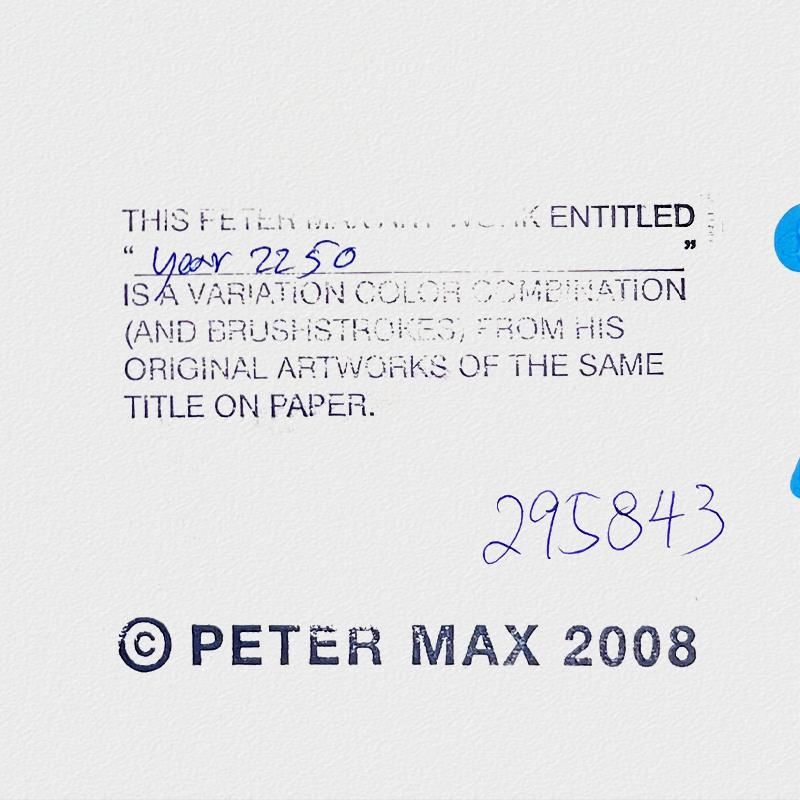 "Year 2250" is a hand signed one-of-a-kind acrylic mixed media on paper by Peter Max. The piece comes custom framed with a backside cutout to display Peter Max Studio registration number 295843 certifying authenticity. Measures approximately 26" x 23" (frame), 13" x 10" (image). This item requires special handling and may have a longer than usual turnaround.