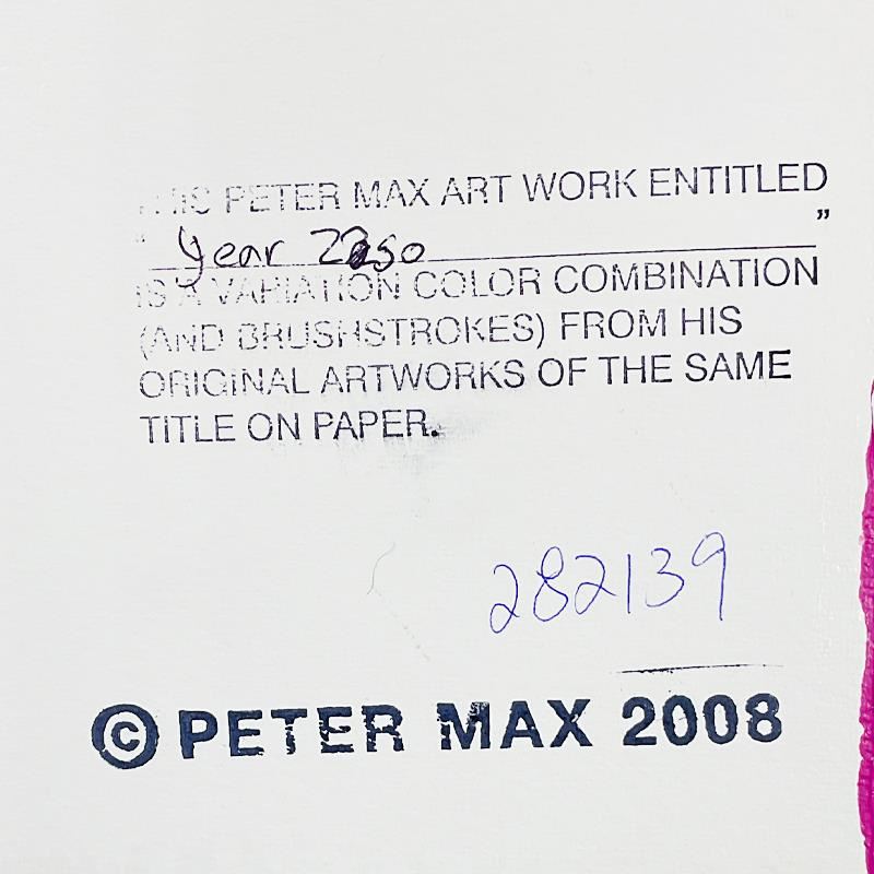 "Year of 2250" is a one-of-a-kind acrylic mixed media on paper, hand signed by Peter Max. The piece comes custom framed with a backside cutout to display Peter Max Studio registration number 282139 certifying authenticity. Measures approx. 26" x 23" (frame), 13" x 10" (image). This item requires special handling and may have a longer than usual turnaround.