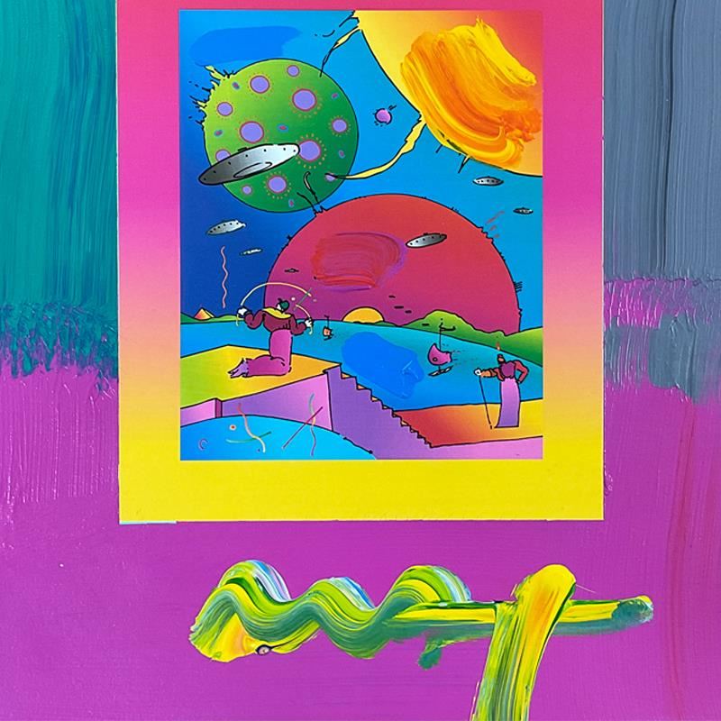 "Year of 2250" is a one-of-a-kind acrylic mixed media on paper, hand signed by Peter Max. The piece comes custom framed with a backside cutout to display Peter Max Studio registration number 282139 certifying authenticity. Measures approx. 26" x 23" (frame), 13" x 10" (image). This item requires special handling and may have a longer than usual turnaround.