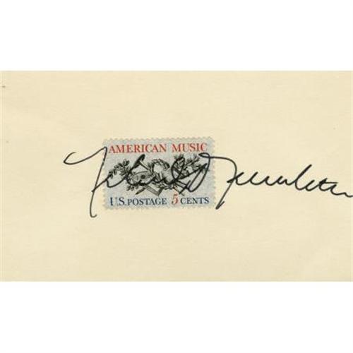 <B>Yehudi Menuhin Autograph.</B></I> A 5" x 3" card, with a five-cent stamp affixed, signed by the celebrated violinist in black ink. Menuhin's autograph extends across the face of the stamp. In Excellent condition.<BR><BR><b>Shipping:</b> Flat Material, Small (<a target="_blank" href="http://www.heritageauctions.com/common/shipping.php">view shipping information</a>)