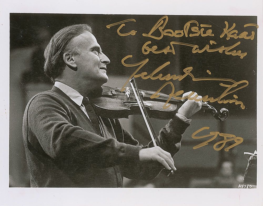 Glossy 10 x 8 photo of the violinist performing, signed and inscribed in gold ink, “To Bootsie Kaat, best wishes, Yehudi Menuhin 1989.” Scattered creases and surface dings, otherwise fine condition.