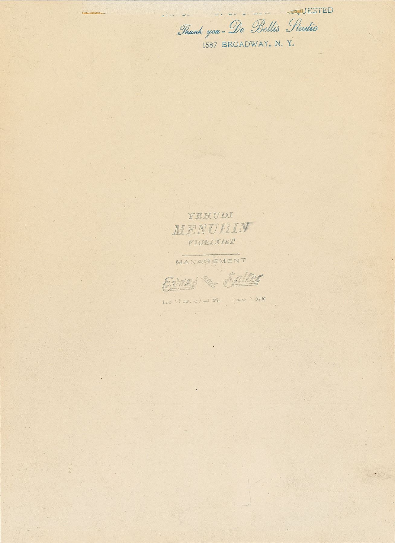Vintage matte-finish 6.5 x 9 photo of Menuhin with his violin by DeBellis of New York, signed and inscribed in fountain pen, and dated "New York, Dec. 1938." Reverse bears a DeBellis Studio stamp. In fine condition, with trimmed edges.