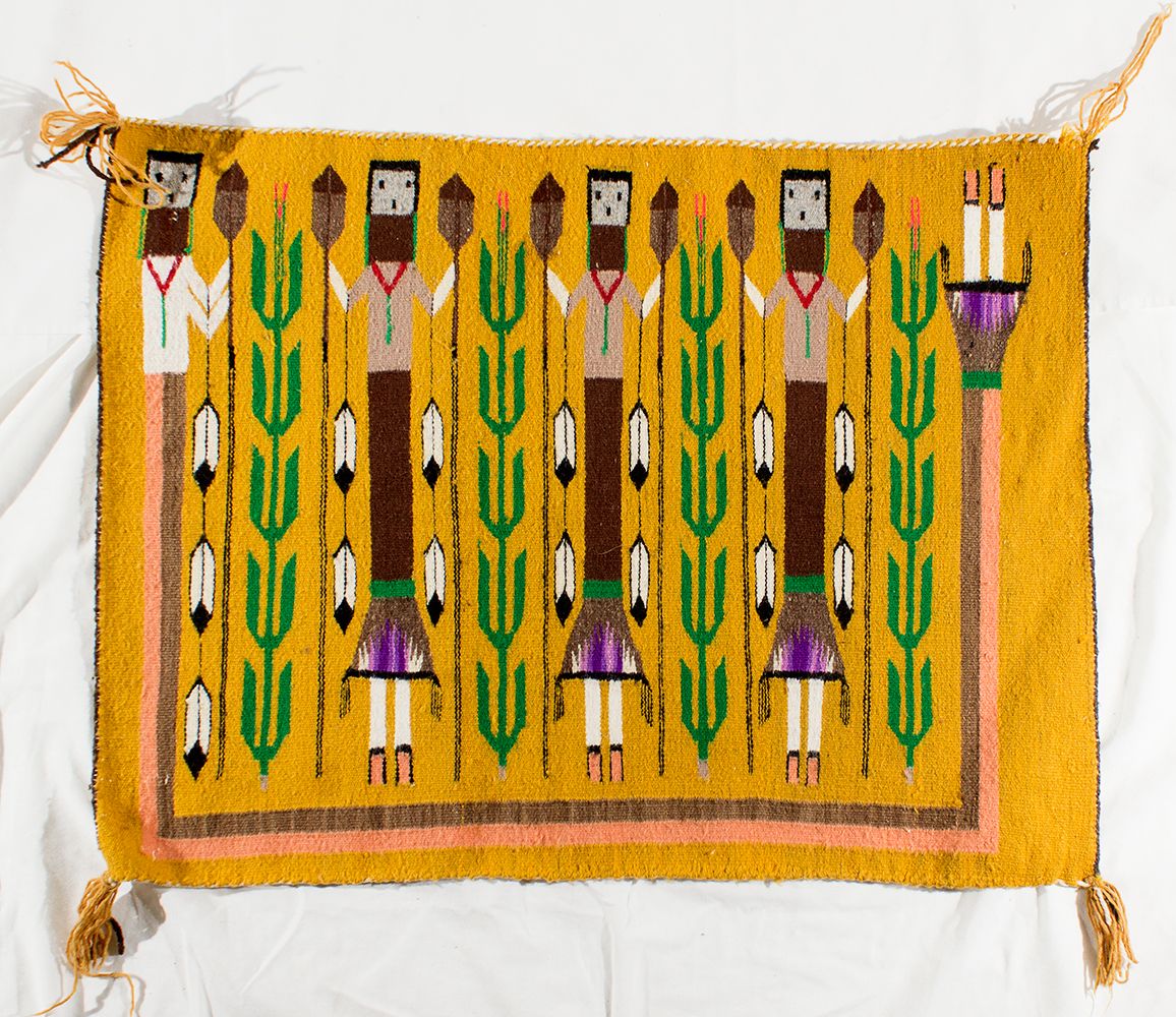 c1940 This is a 31” x 23.5” rug that features key Navajo pictorials. There are 3 small Yei figures surrounded by tall corn stalk lines. On the left a large Yei figure can be seen holding an arrow. The large Yei is connect to the border and attached the sunburst design, which can be seen on the right. The rug has some wear, but has beautiful and vibrate colors. - HKA#66332