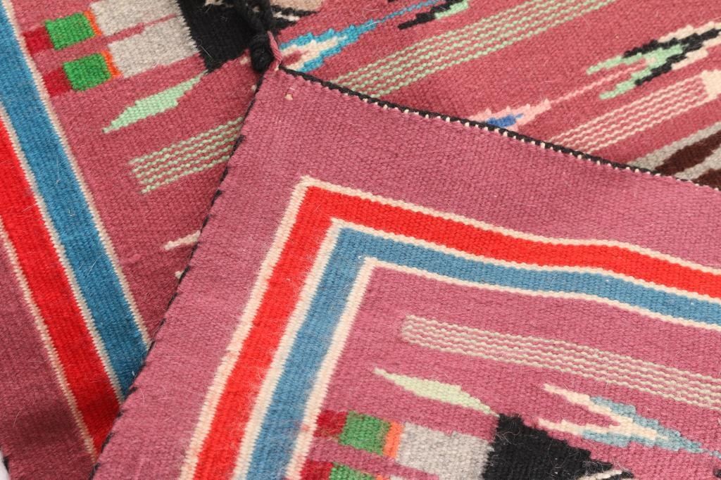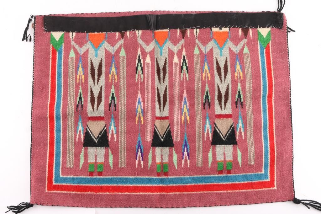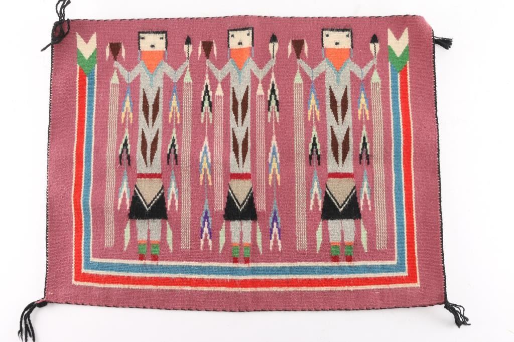 Smaller Yei rug with pink background. Three figure, table top type. 25" x 19".