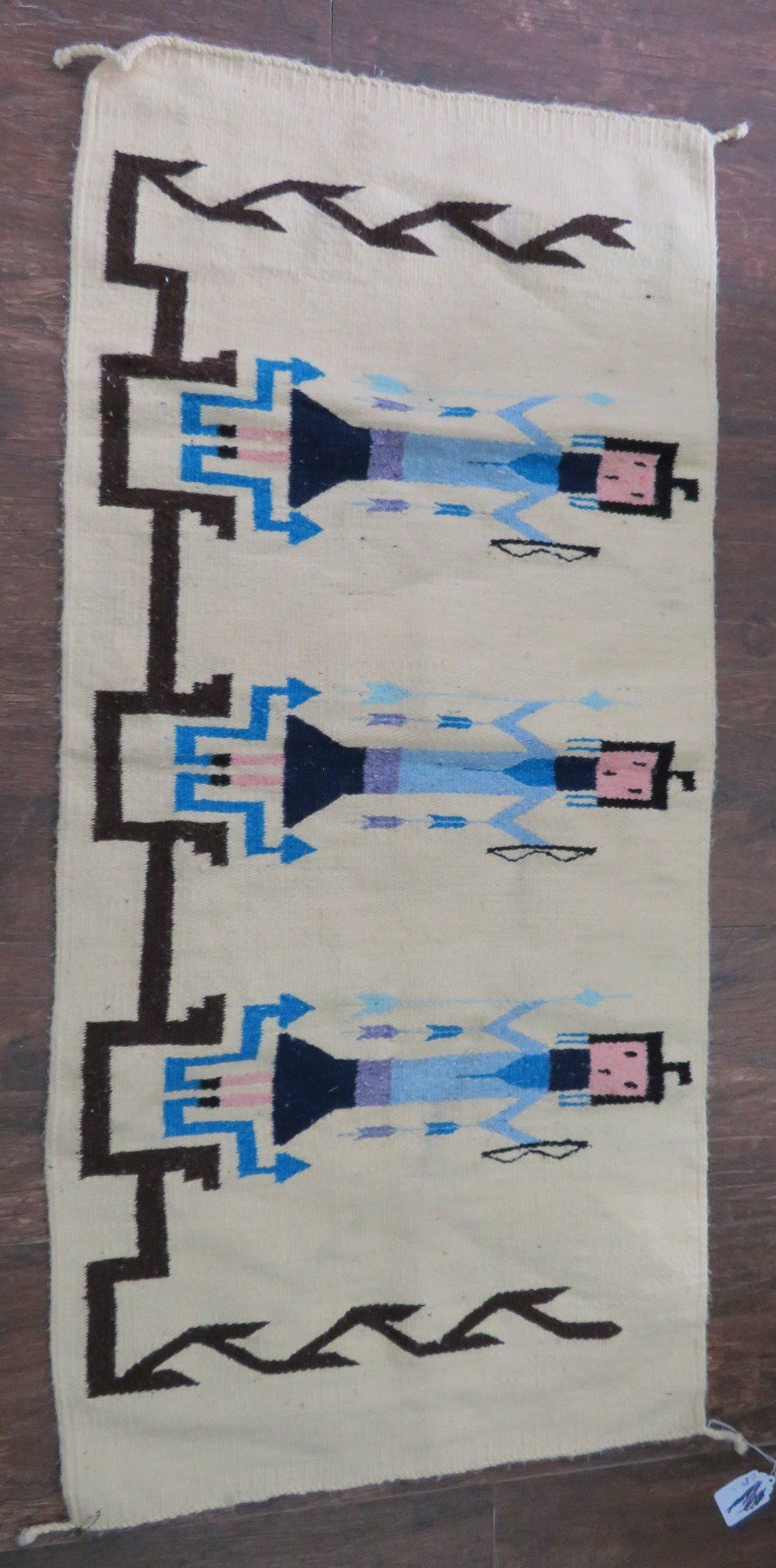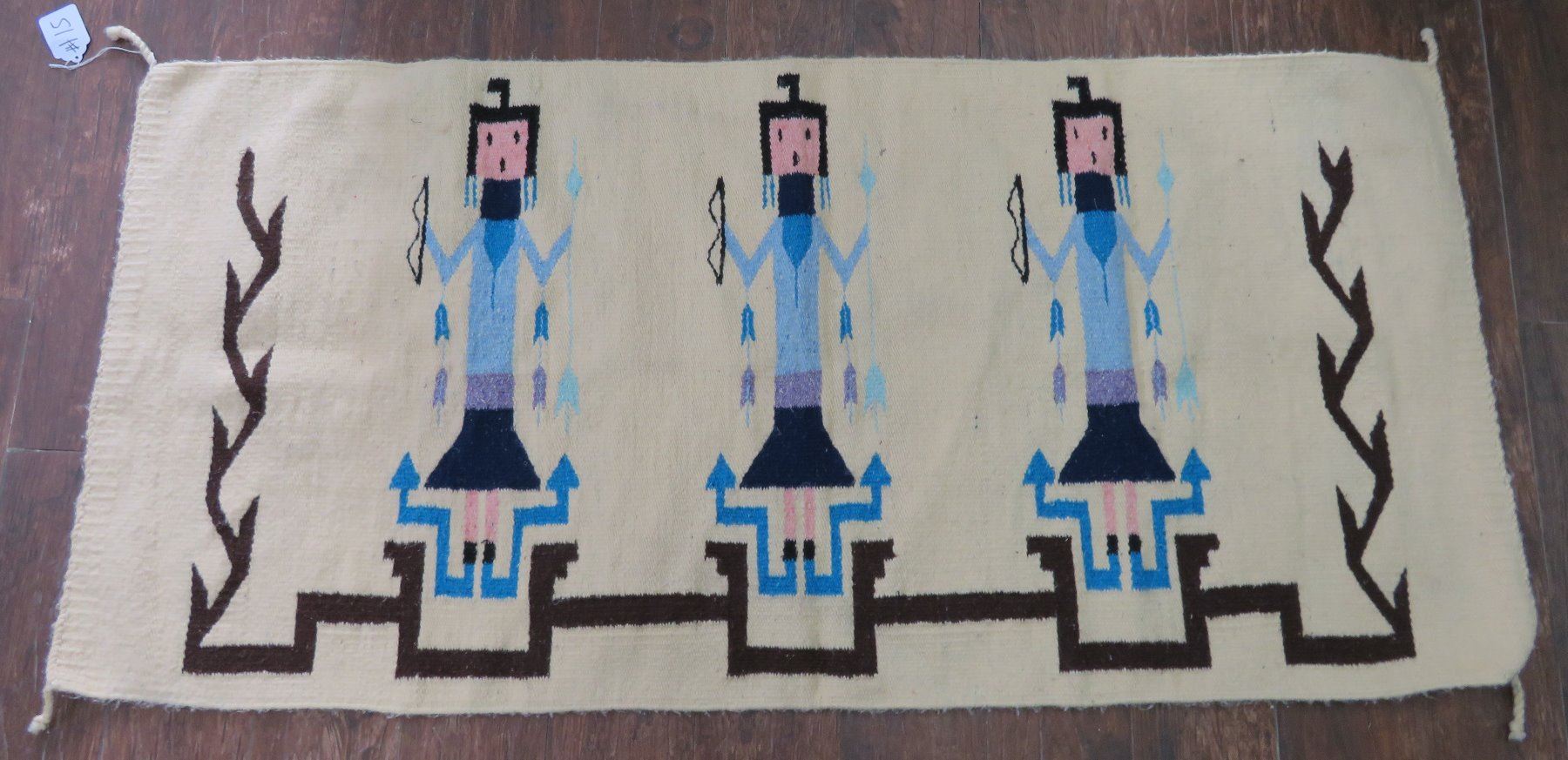 Yei-Style Weaving, c. 1940s. Made of cotton and wool, the item measures 59" x 28". Central Mexico. 3 Yei-style figures holding bows, with corn stalks, etc. Nice eye-catching rug with nice feel. Condition: Good, see images. Shipping: $20.00 w/insurance and signature.