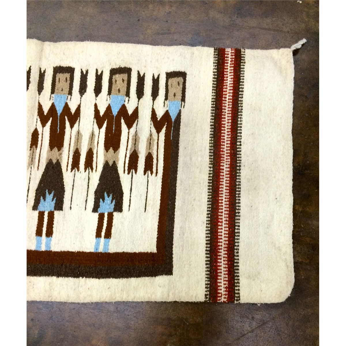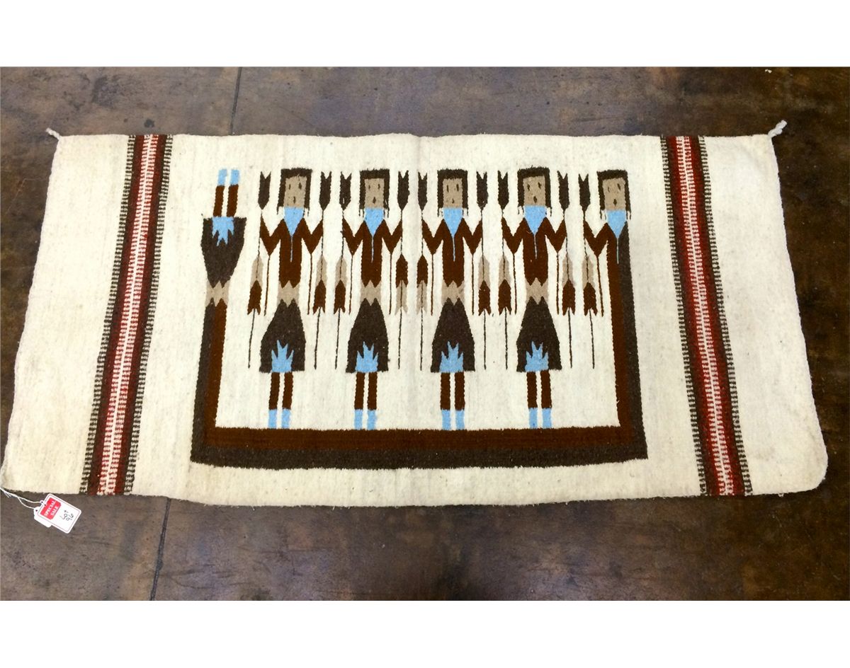 This southwestern style rug is done in a Yei pattern. This is a handmade rug, but probably of “south of the border” origin. It measures approximately 29" x 60.5".
