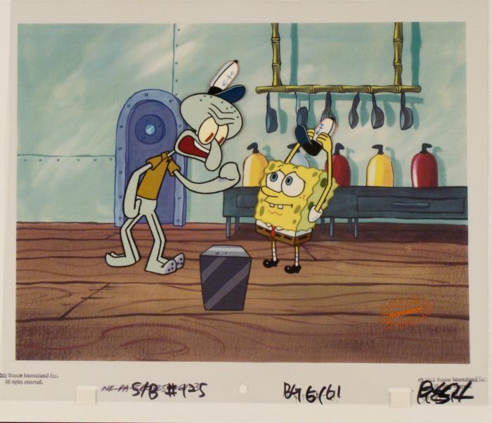 This animation cel and reproduction background are from the Nickelodeon TV show SpongeBob Squarepants. The story takes place under the deep blue sea in Bikini Bottom, where SpongeBob resides. SpongeBob, who is a yellow, porous sponge, is your typical happy-go-lucky character, as he is always cheerful and enjoys making people laugh. Patrick Star, SpongeBob's neighbor who is a starfish, is your average children's show idiot, as he boasts knowing nothing and is often getting himself into ridiculous situations. Between the homes of these two lies the home of the miserable Squidward, a squid, who is known for being grouchy and playing tricks on SpongeBob and Patrick. Both SpongeBob and Squidward work at the Krusty Krab, a fast food business run by the greedy money-loving Mr. Krabs, a crab, the arch rival of the evil, possibly misunderstood, Plankton. Another neighbor, Sandy Cheeks, an athletic squirrel who normally wears an astronaut's space suit, was introduced in "Tea at the Treedome." She spends most of her time inventing and experimenting. Squidward is yelling at SpongeBob.Original Printed Background and Animated Cel Overall Size of Background: 11" x 17" Overall Size of the Cel: 10 1/2" x 12 1/2" Very good condition This is an original hand-painted cel set-up used in the production of an episode of "SpongeBob SquarePants." Each one-of-a-kind set-up represents a slight change in position of the characters. When individually photographed and projected in rapid succession, the images appear to move.