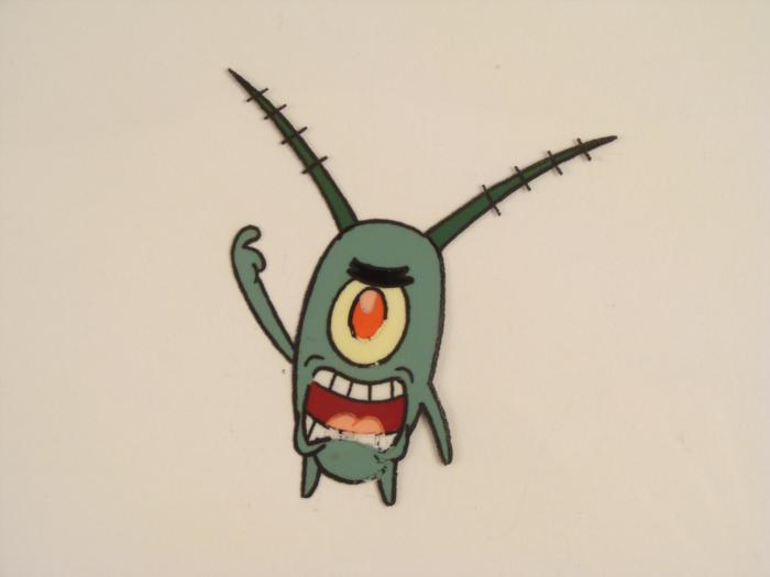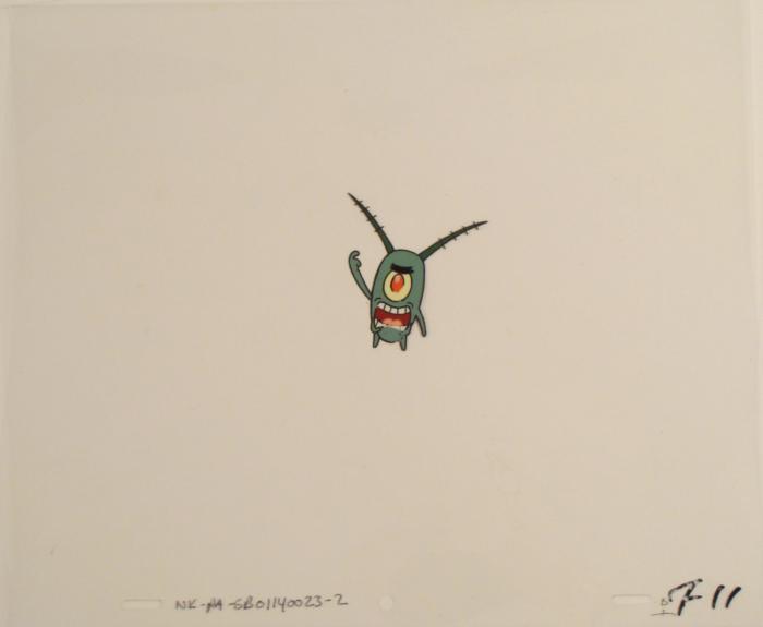 This original animation cel is from the Nickelodeon TV show SpongeBob Squarepants. The story takes place under the deep blue sea in Bikini Bottom, where SpongeBob resides. SpongeBob, who is a yellow, porous sponge, is your typical happy-go-lucky character, as he is always cheerful and enjoys making people laugh. Patrick Star, SpongeBob's neighbor who is a starfish, is your average children's show idiot, as he boasts knowing nothing and is often getting himself into ridiculous situations. Between the homes of these two lies the home of the miserable Squidward, a squid, who is known for being grouchy and playing tricks on SpongeBob and Patrick. Both SpongeBob and Squidward work at the Krusty Krab, a fast food business run by the greedy money-loving Mr. Krabs, a crab, the arch rival of the evil, possibly misunderstood, Plankton. Another neighbor, Sandy Cheeks, an athletic squirrel who normally wears an astronaut's space suit, was introduced in "Tea at the Treedome." She spends most of her time inventing and experimenting. Plankton does not look happy!Original Production Animated Cel Overall Size of Cel: 10 1/2" x 12 1/2" Very Good ConditionThis is an original hand-painted cel set-up used in the production of an episode of "SpongeBob SquarePants." Each one-of-a-kind set-up represents a slight change in position of the characters. When individually photographed and projected in rapid succession, the images appear to move.