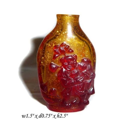 This is a hand-made high quality Peking glass snuff bottle. Inside the yellow base is golden flask mixed in. The red color motif of kids playing has precise detail. The decent and delicate make this snuff bottle a great collection item as well as a treasure gift. </p>