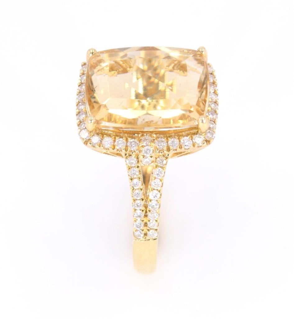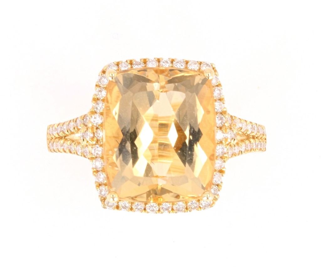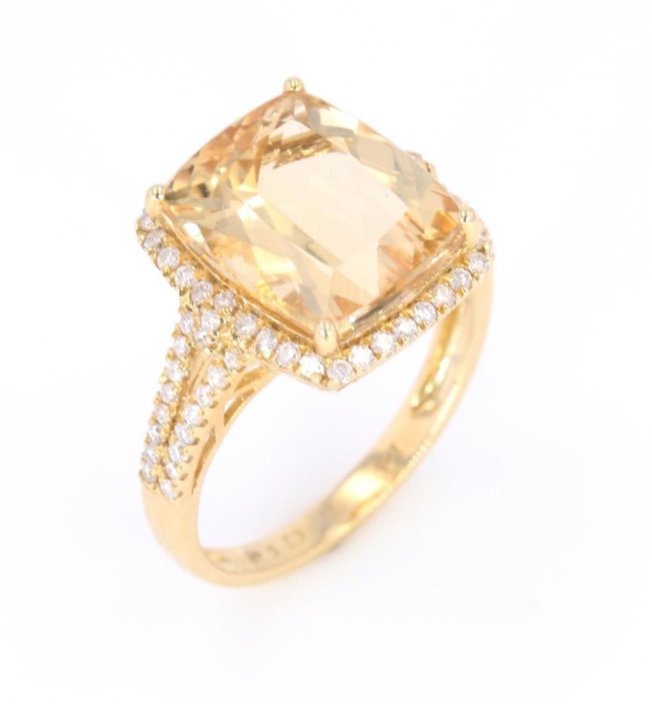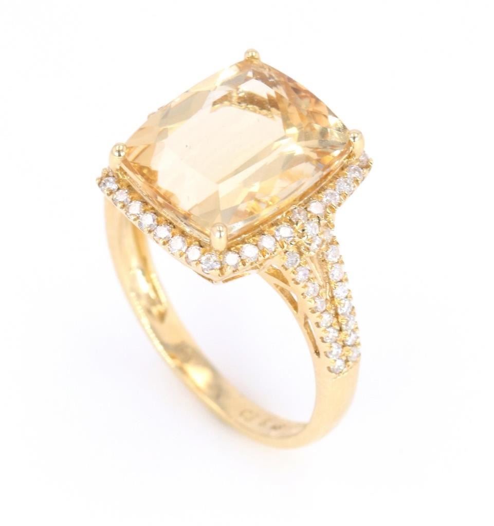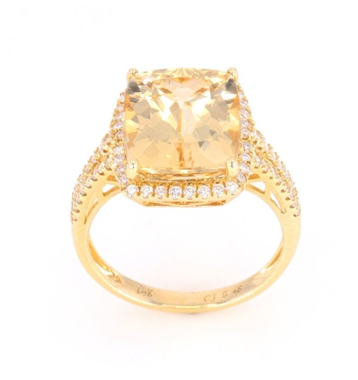 This is an excellent Yellow Beryl set with Diamonds in a 14K gold ring. The ring shows all 14 karat yellow gold stamped 14K and showing 3.07 grams of gold weight. At the center of the setting shows a four-prong set large cushion cut Yellow Beryl stone with weight of 5.48 carats and nice eye clarity with nice cut. The ring also shows a halo bezel and split shoulder all being set with 70 round brilliant cut diamonds with a weight of 0.43 carats. The ring is a size 7 US.