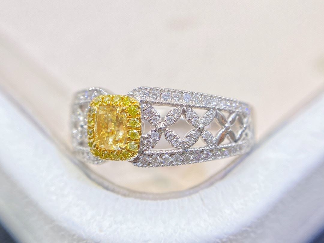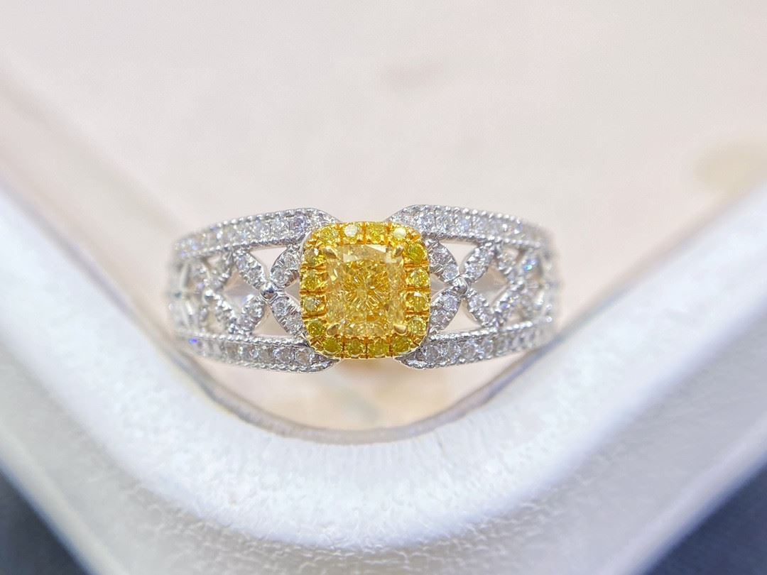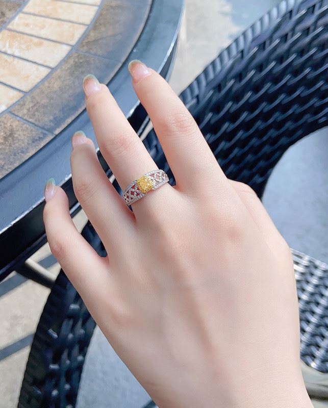 The centerpiece is a brilliant cushion-cut yellow diamond, glowing with vibrant radiance. The openwork band, adorned with pavé-set diamonds, adds depth and sophistication, perfectly balancing elegance and modern artistry.Ring size: 6, circumference: 52 mm, diameter: 16.6 mm, main diamond: 0.331ct, side diamond: 0.23ct. Note: Comes with an AGL certificate and a domestic jewelry identification certificate.