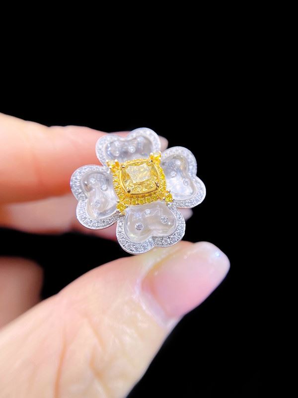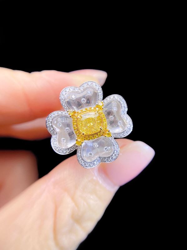A vivid yellow diamond sits at the center of four crystal petals, forming a lucky clover silhouette. Delicate diamonds trace the edges, creating a fresh, luminous look that symbolizes luck and radiant charm. Main diamond: 1.0ct, side diamonds: 0.476 ct. Note: Comes with a GIA Natural Diamond Report.