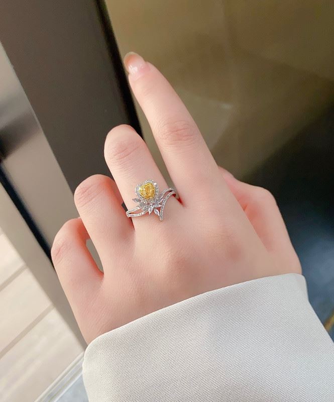 This yellow diamond heart ring features a stunning heart-shaped yellow diamond at its center, surrounded by sparkling white diamonds and delicate leaf designs, creating a perfect blend of romance and luxury. The warm yellow hue of the diamond contrasts beautifully with the pure brilliance of the white diamonds, making it a modern yet elegant piece that symbolizes love and beauty.Ring size: 6, circumference: 52 mm, diameter: 16.6 mm, main diamond: 0.212 ct, side diamonds: 0.323 ct.
