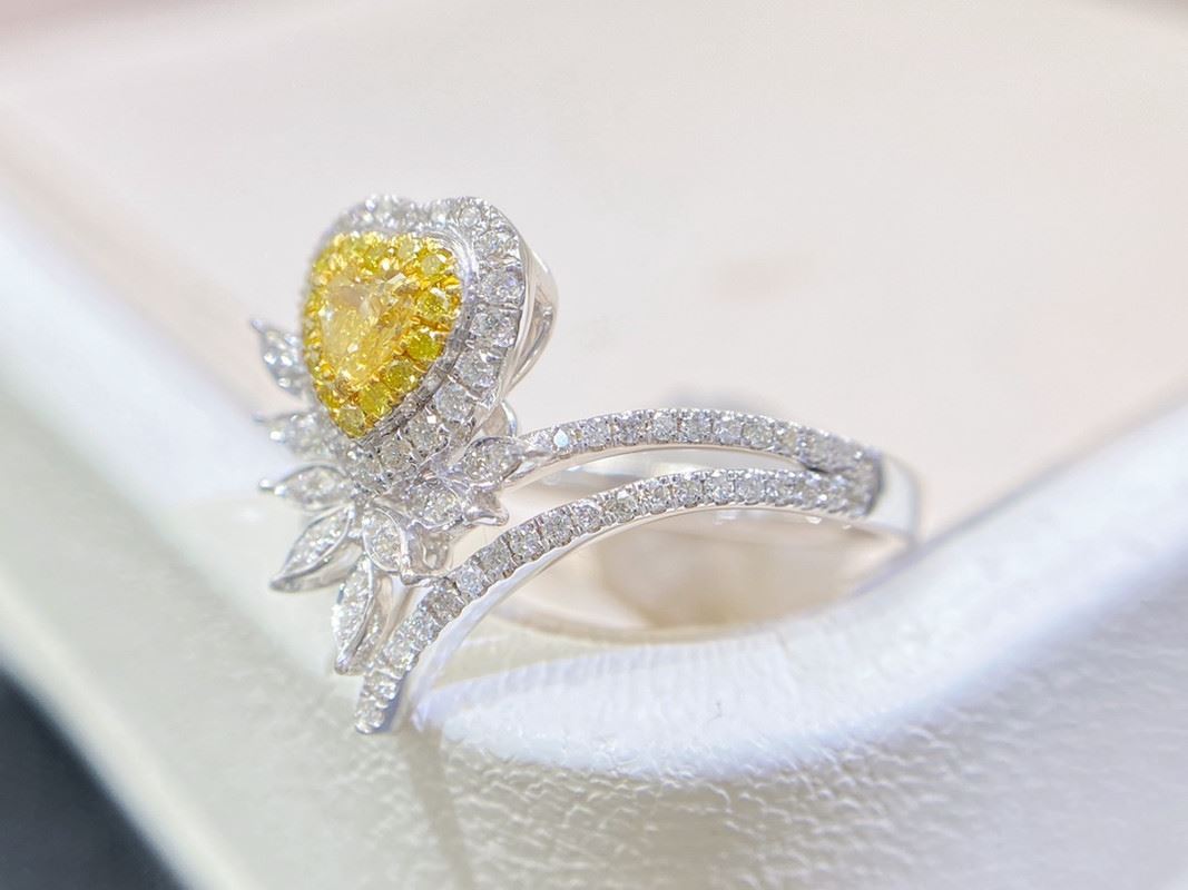 This yellow diamond heart ring features a stunning heart-shaped yellow diamond at its center, surrounded by sparkling white diamonds and delicate leaf designs, creating a perfect blend of romance and luxury. The warm yellow hue of the diamond contrasts beautifully with the pure brilliance of the white diamonds, making it a modern yet elegant piece that symbolizes love and beauty.Ring size: 6, circumference: 52 mm, diameter: 16.6 mm, main diamond: 0.212 ct, side diamonds: 0.323 ct.Note: Comes with a GUILD certificate.