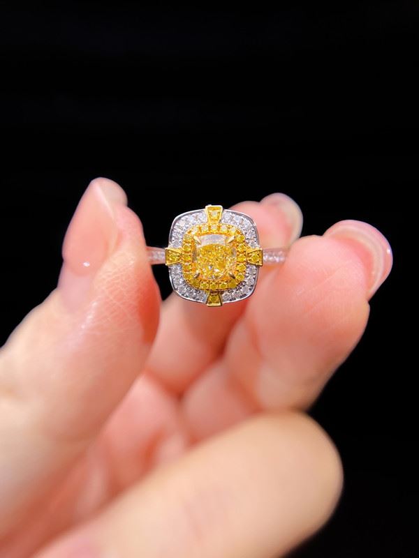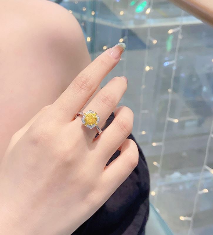 This yellow diamond ring features a radiant yellow diamond at the center, surrounded by layers of brilliant white diamonds in a refined square halo design. The warm glow of the yellow diamond contrasts beautifully with the sparkling brilliance of the white diamonds, creating an aura of elegance and sophistication. Simple yet luxurious, this ring is a timeless statement of confidence and refined beauty.Ring size: 6, circumference: 52 mm, diameter: 16.6 mm, main diamond: 0.70 ct, side diamonds: 0.27 ct.