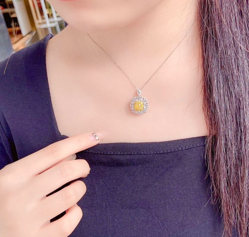 This GAI yellow diamond ring features a brilliant yellow diamond at the center, surrounded by exquisite white diamonds arranged in a stunning floral design. The warm hue of the yellow diamond perfectly complements the sparkling brilliance of the surrounding diamonds, embodying elegance and luxury. Whether for everyday wear or special occasions, this ring is sure to be a dazzling statement piece.Ring size: 6, circumference: 52 mm, diameter: 16.6 mm, main diamond: 1.00 ct, side diamonds: 1.105 ct.Note: GIA Natural Diamond Report.