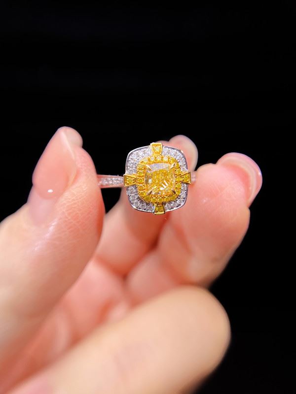 This yellow diamond ring features a radiant yellow diamond at the center, surrounded by layers of brilliant white diamonds in a refined square halo design. The warm glow of the yellow diamond contrasts beautifully with the sparkling brilliance of the white diamonds, creating an aura of elegance and sophistication. Simple yet luxurious, this ring is a timeless statement of confidence and refined beauty.Ring size: 6, circumference: 52 mm, diameter: 16.6 mm, main diamond: 0.70 ct, side diamonds: 0.27 ct.Note: Comes with a GIA Natural Diamond Report.