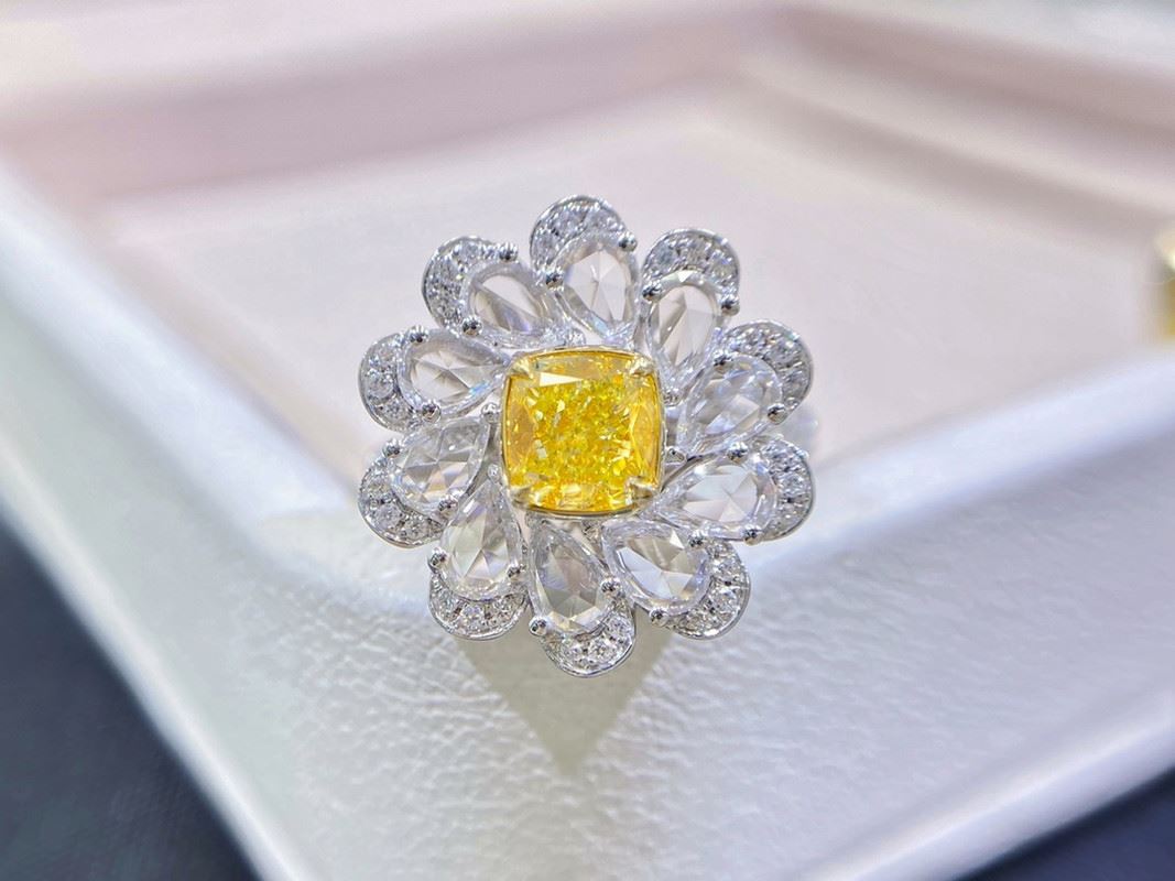 This yellow diamond ring features a brilliant yellow diamond at the center, surrounded by pear-shaped white diamonds that create a stunning floral design. The warm hue of the yellow diamond beautifully contrasts with the brilliance of the white diamonds, exuding both luxury and elegance. With its simple yet sophisticated design, this ring is perfect for any occasion, making it an ideal choice for showcasing a woman's noble charm.Ring size: 6, circumference: 52 mm, diameter: 16.6 mm, main diamond: 0.81 ct, side diamonds: 0.939 ct.Note: Comes with a GIA Natural Diamond Report.