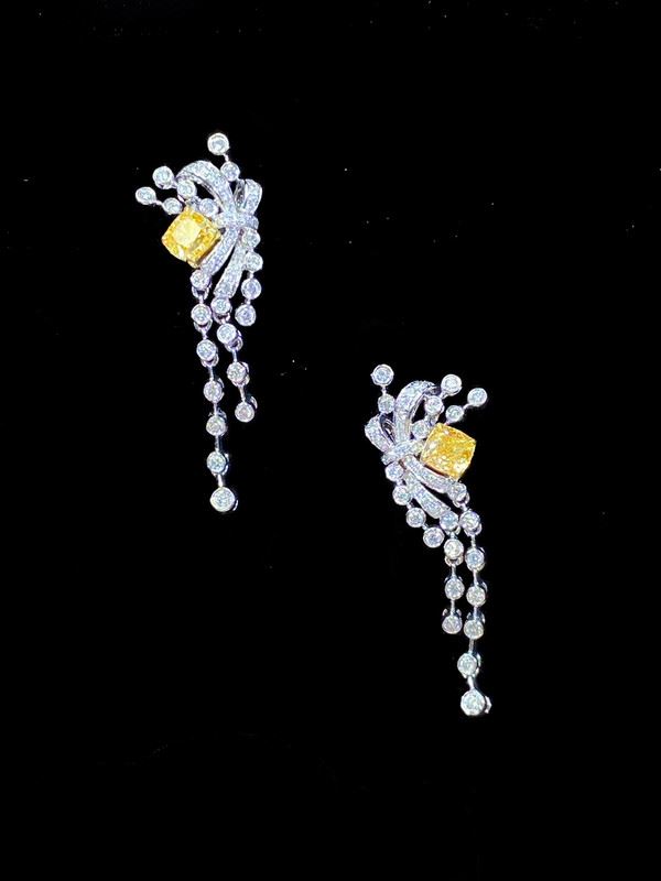 Square yellow diamonds take center stage, paired with cascading diamond strands that shimmer with every movement. The design flows gracefully, combining modern sophistication with timeless elegance.Main diamond: 0.654ct, side diamond: 0.458ct. Note: Comes with an AGL certificate and a domestic jewelry identification certificate.
