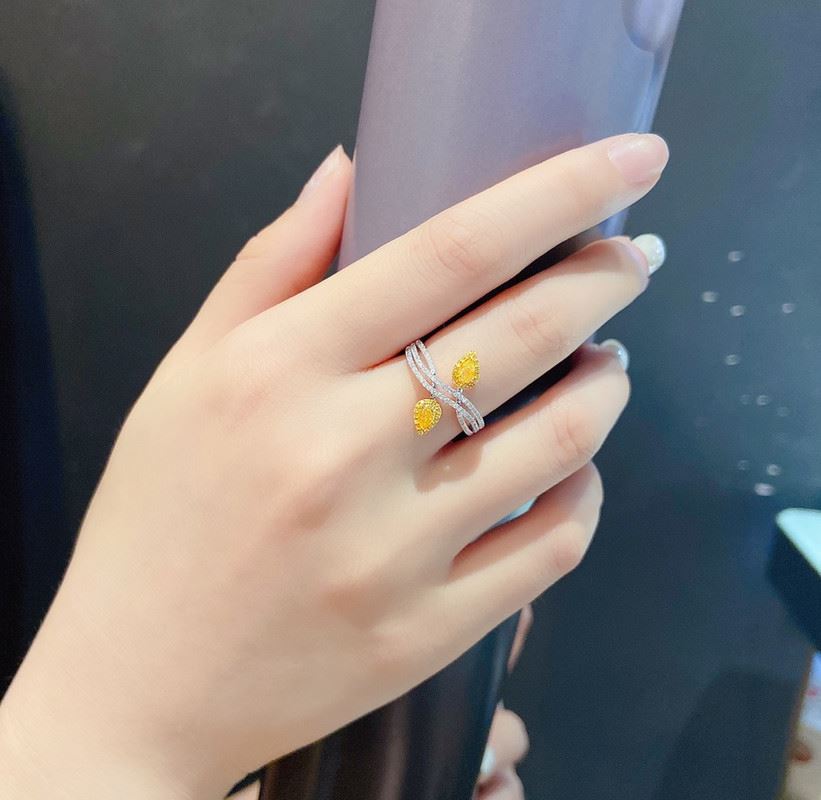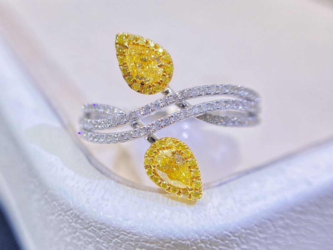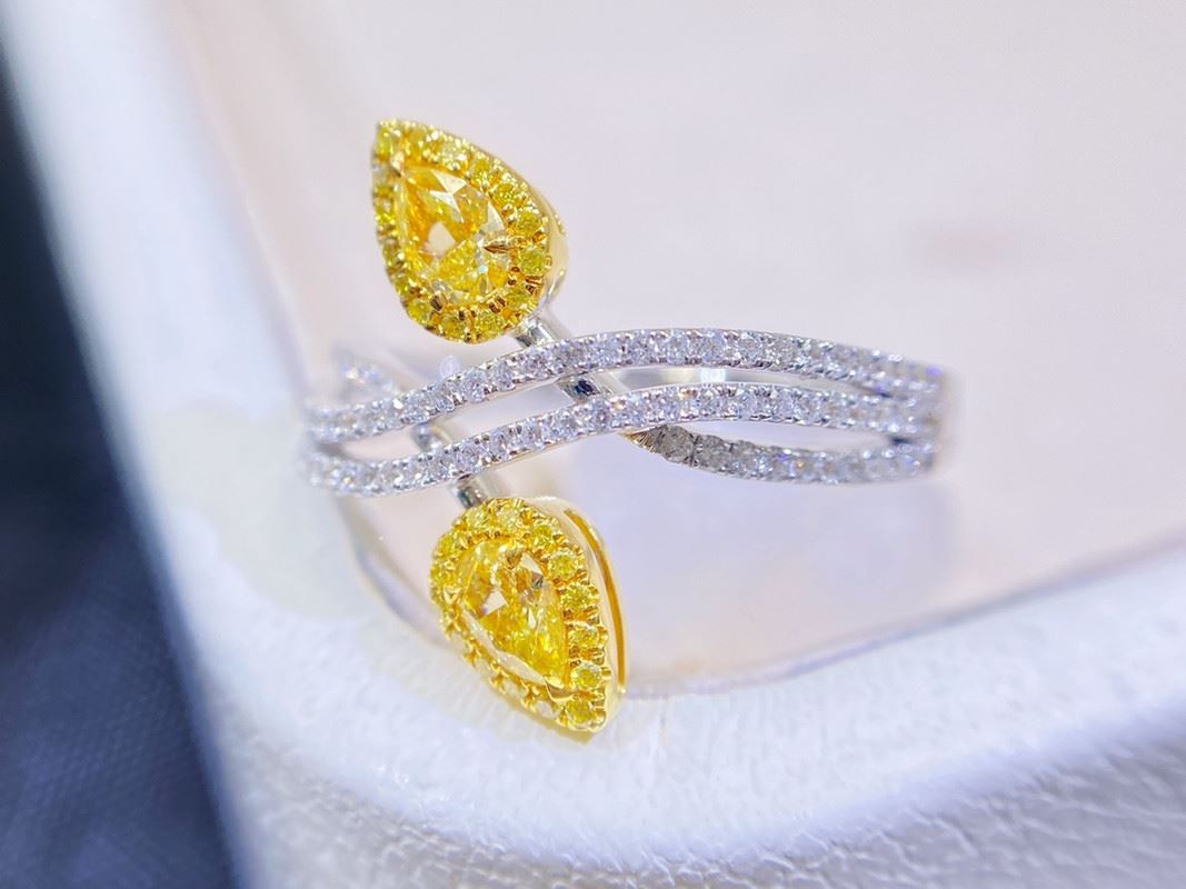Two yellow pear-shaped diamonds sit at each end of the open band, which is paved with sparkling diamonds. The flowing lines create a lively yet refined look, full of modern elegance.Ring size: 6, circumference: 52 mm, diameter: 16.6 mm, main stone: 0.301ct, side diamonds: 0.287ct. Note: Comes with an AGL certificate and a domestic jewelry identification certificate.