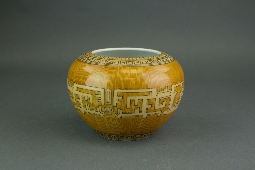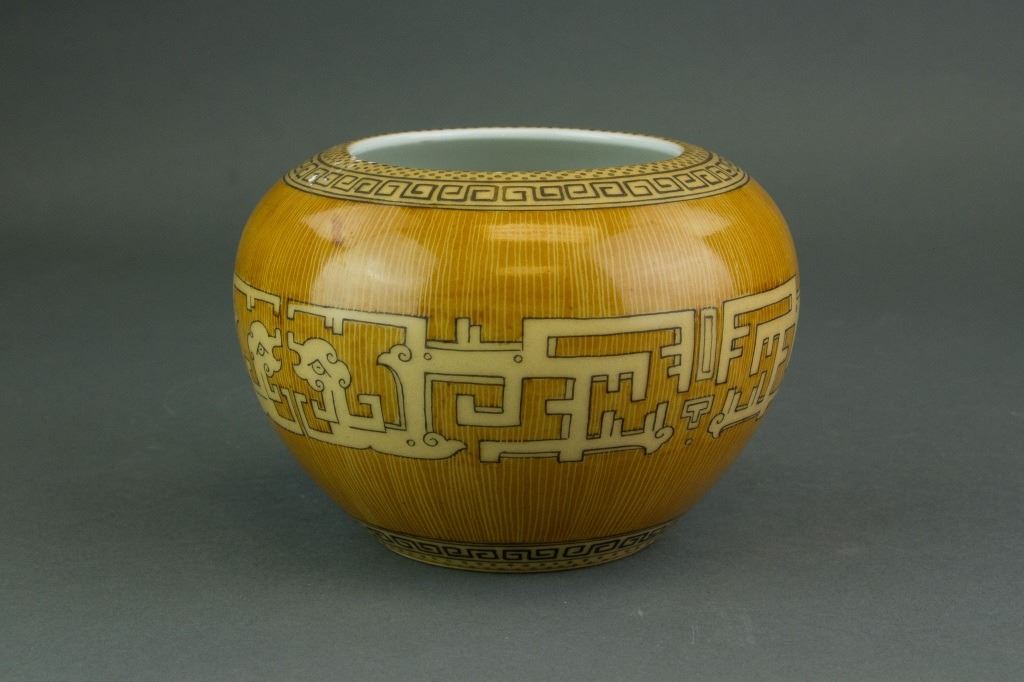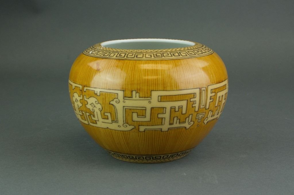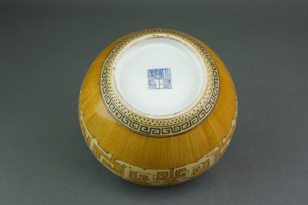 Chinese yellow painted porcelain water bowl; with inverted rim; featuring archaistic dragon pattern on yellow ground; six-character Yongzheng mark on base; H: 10.5 cm, W: 14 cm, 682 grams