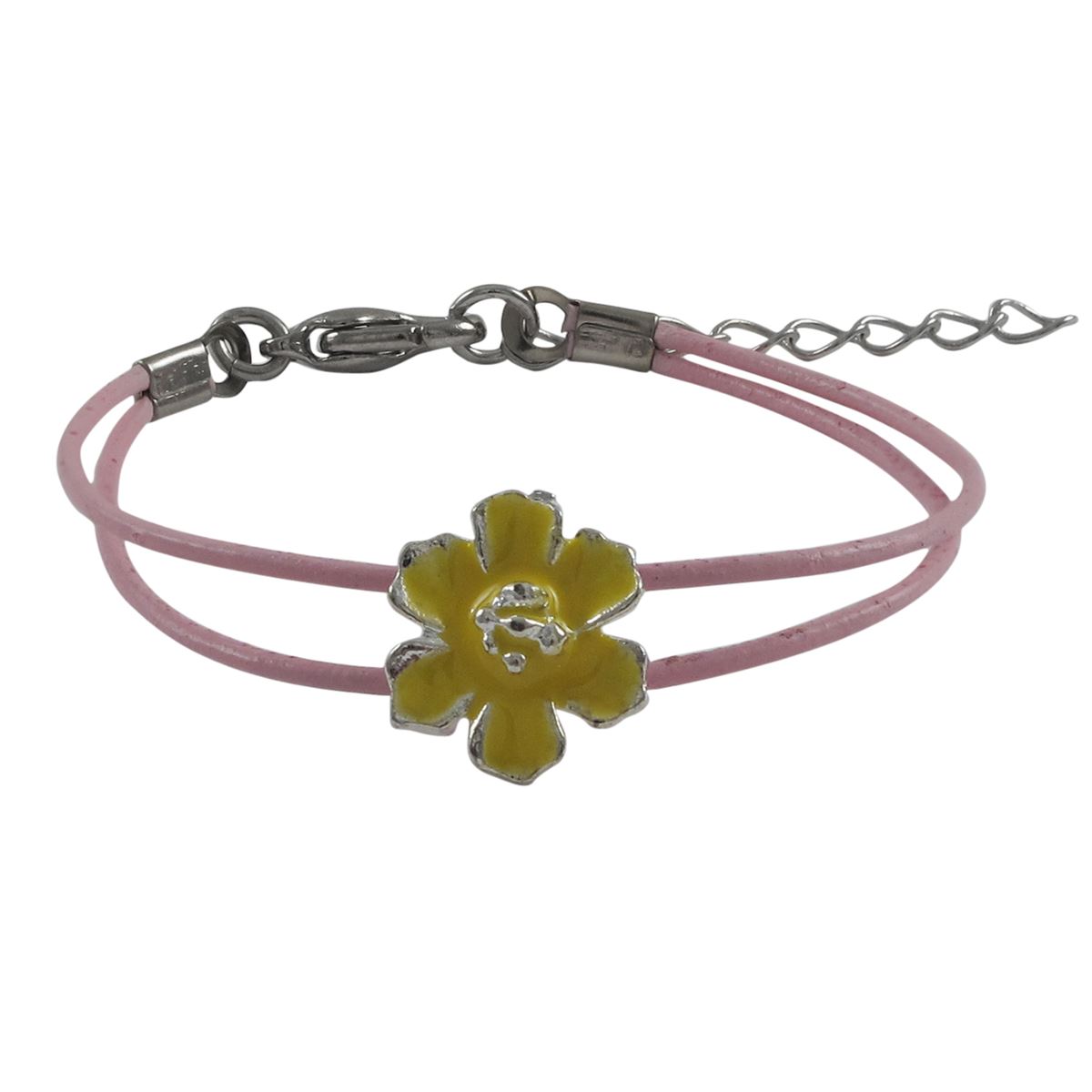 Yellow Enamel 12Mm Flower On Two Row Pink Cord, Rhodium Plated Brass Bracelet, 5" 1"