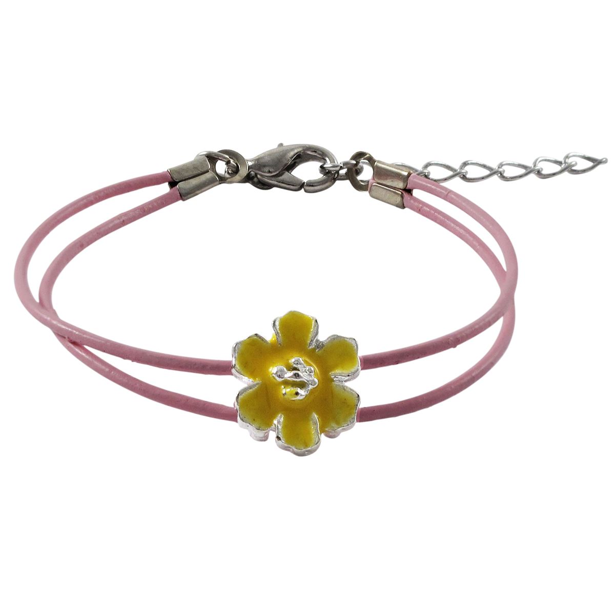 Yellow Enamel 12Mm Flower On Two Row Pink Cord, Rhodium Plated Brass Bracelet, 6" 1"