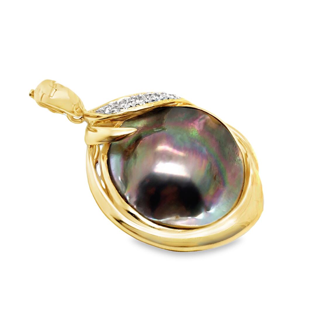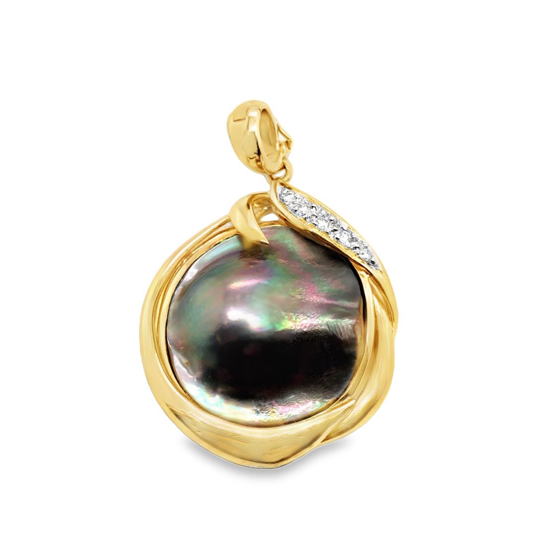 S/9.1-YEY TITLE DESCRIPTION: Yellow Gold Black Tahitian Pearl & Diamond Pendant DESCRIPTION DETAIL: A unique pendant featuring a large Tahitian Blister Pearl accented by round brilliant cut natural Diamonds set in 14k Yellow Gold. OVERALL CONDITION: Excellent, Estate STONE: Tahitian Blister Pearl Size: 20mm Shape: Round Color: Green, Purple, Yellow, Blue, Black, Grey DIAMONDS: Natural Weight: ~0.05 Carats Total Weight Shape: Round, Brilliant-Cut Color: H - I Clarity: SI2 - I1 METAL: 14k Yellow Gold WEIGHT: 9.1 Grams SIZE: 1.5" X 1" This description and condition report is provided for your convenience based on the information provided by the consignor with an estimated retail value of $2,700.00. PRIOR TO BIDDING READ THE DESCRIPTION, TERMS, AND CONDITIONS CAREFULLY CAA is not responsible for any discrepancies between this information and other opinions. Buyers Premium: 18% Shipping Billed Separately Payment Due in 5 days All items shipped to registered address - NO EXCEPTIONS