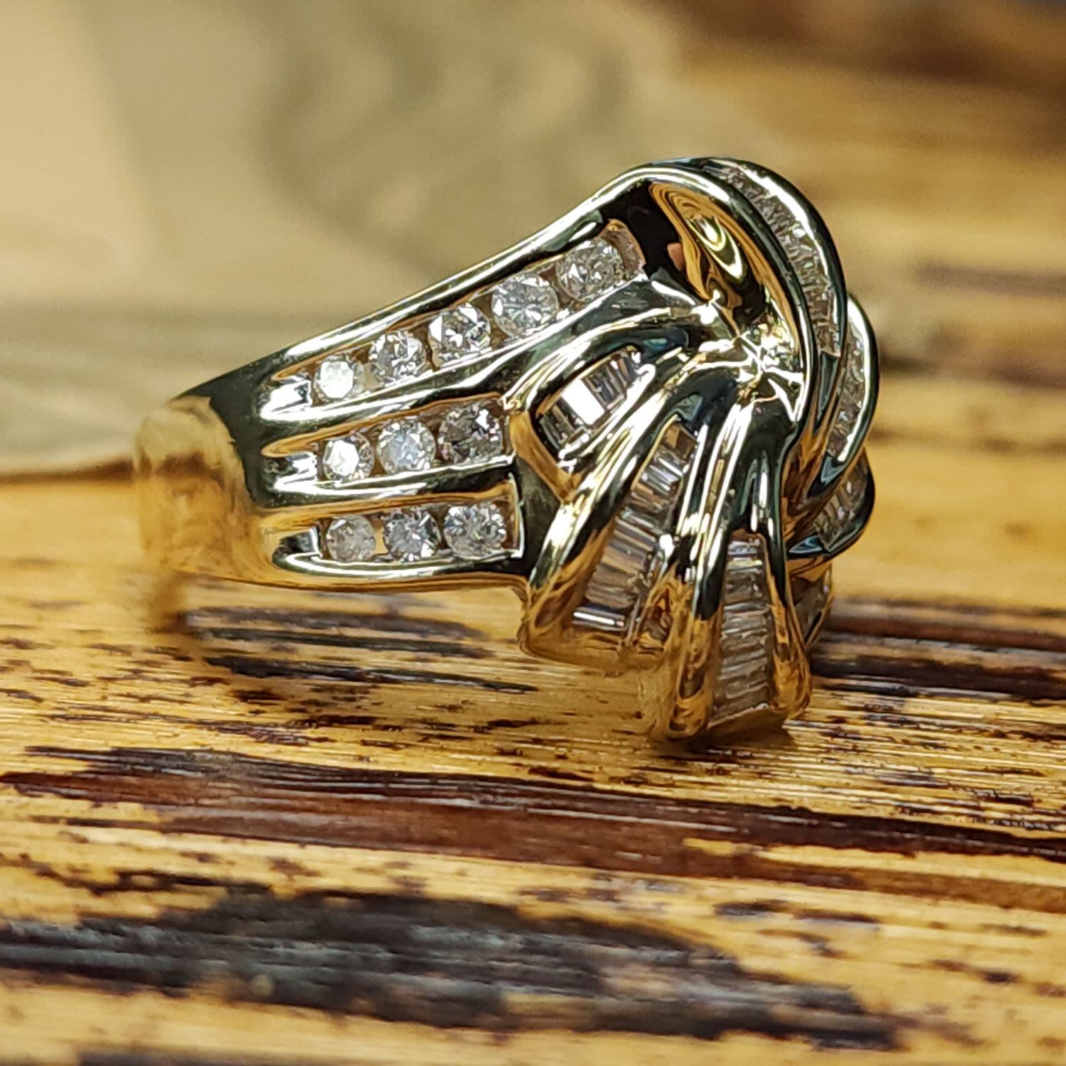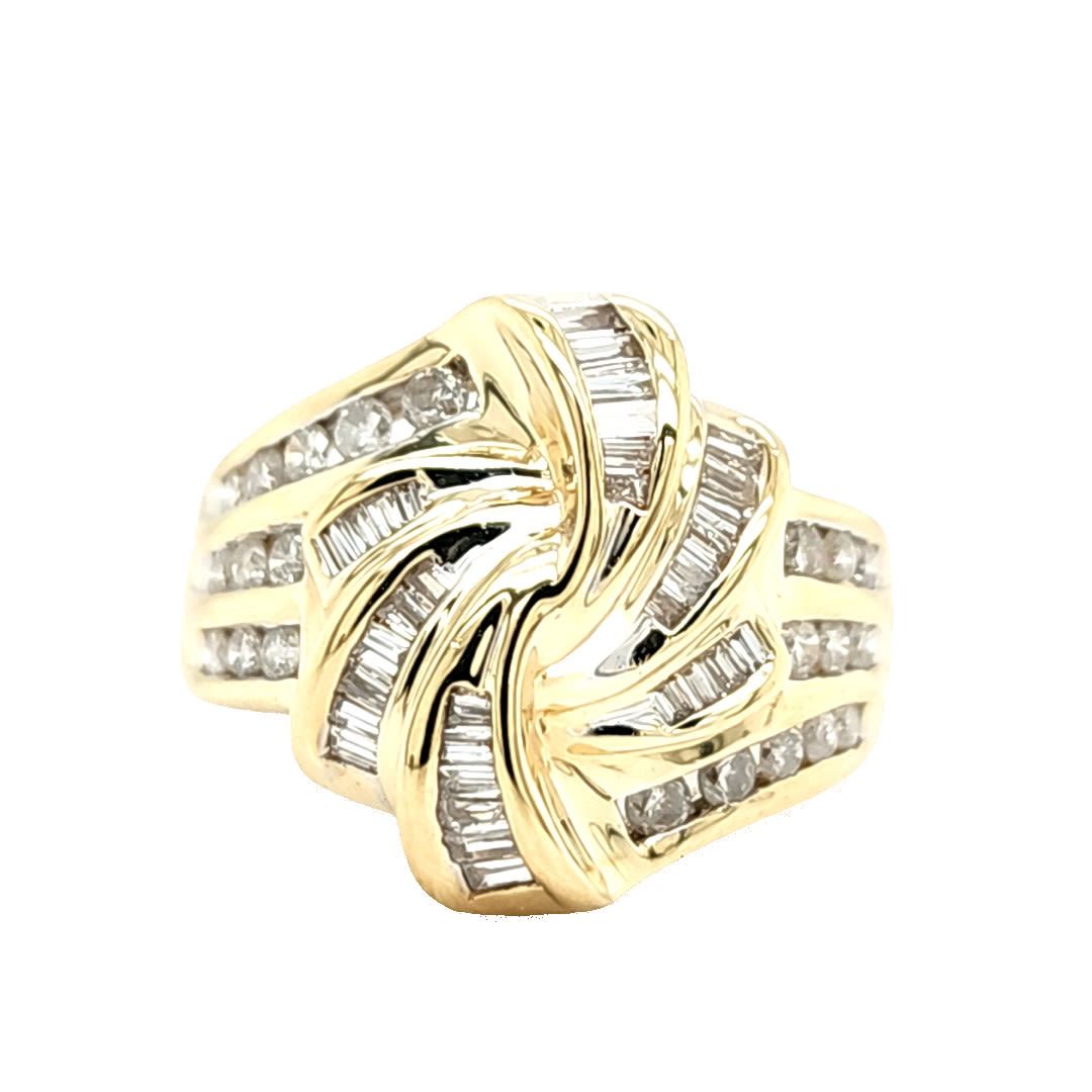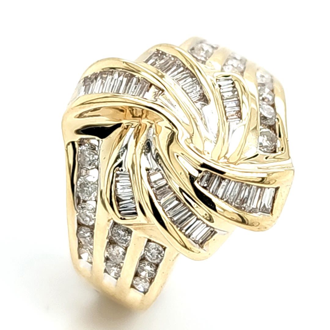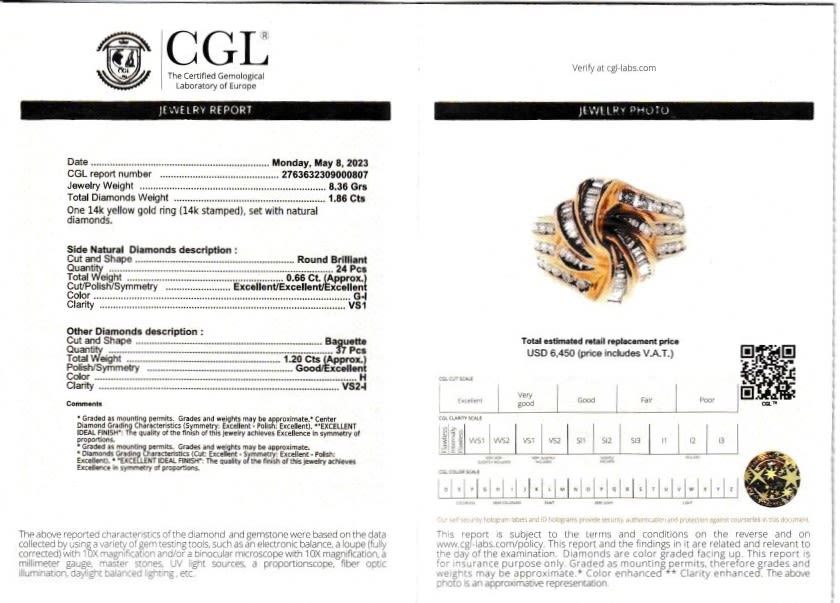 S5/5.4 - MYS TITLE DESCRIPTION: Samuel Aaron Diamond Pinwheel Bow Ring DESCRIPTION DETAIL: A stunning dress ring featuring round and baguette cut natural Diamonds set in 14K Yellow Gold in a pinwheel design. OVERALL CONDITION: Excellent, Like New DIAMONDS: Natural Weight: 0.66 Carats Total Weight (approximate) Shape: Round, Brilliant-Cut Color: G-I Clarity: VS1 DIAMONDS: Natural Weight: 1.20 Carats Total Weight (approximate) Shape: Baguette Color: H Clarity: VS2-I1 METAL: 14K Yellow Gold WEIGHT: 8.36 Grams SIZE: 8.25 APPRAISAL REPORT: This ring is certified and appraised for $6,450.00 estimated retail replacement value by The Certified Gemological Laboratory of Europe (CGL). Please inquire about sizing if needed, and allow an additional 10 days for shipping if we resize it. Auction Code: S5/5.4 - mys THIS ITEM IS CONSIGNED FROM A VERY PROMINENT STUART FAMILY WITH A VERY LOW RESERVE PRIOR TO BIDDING READ THE DESCRIPTION, TERMS, AND CONDITIONS CAREFULLY This description and condition report is provided for your convenience based on the information provided by the consignor. CAA is not responsible for any discrepancies between this information and other opinions. Buyers Premium: 18% Shipping Billed Separately Payment Due in 7 days All items shipped to registered address - NO EXCEPTIONS .