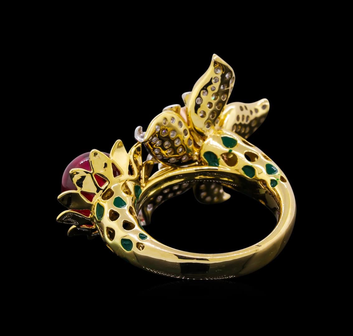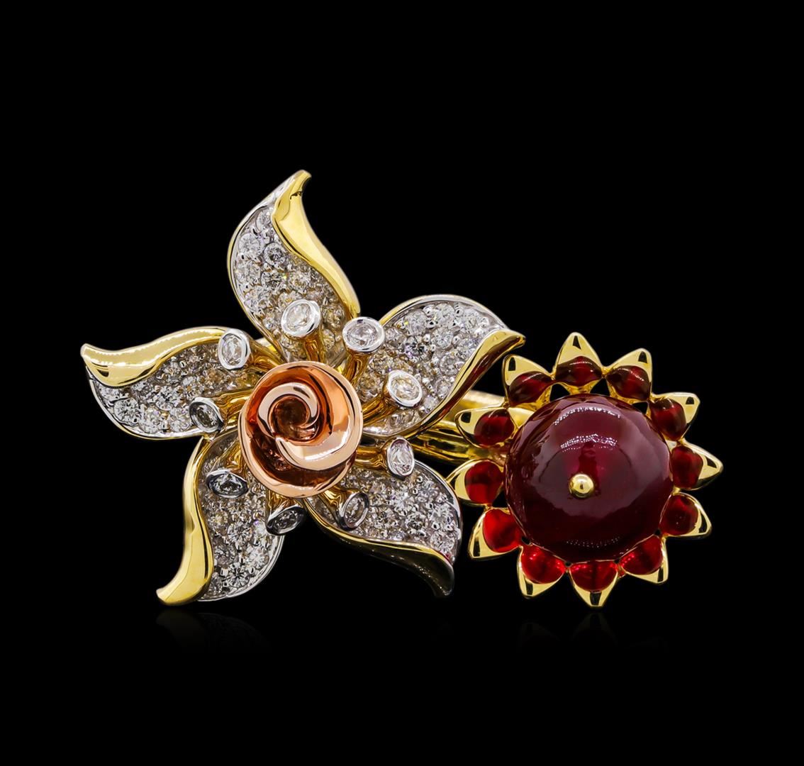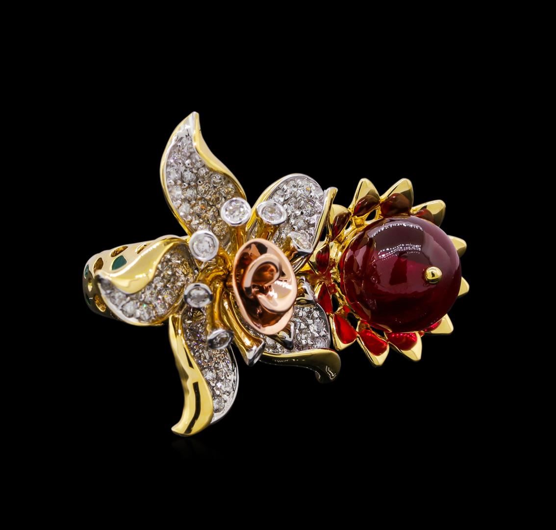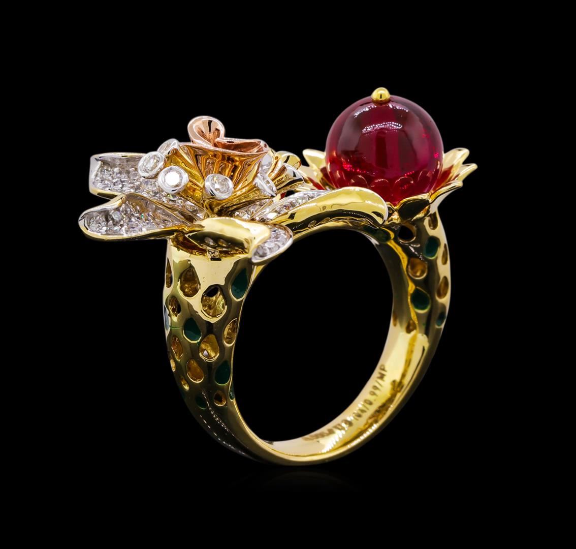 One yellow gold ring, partly rhodium plated, weighing in total 12.28 grams, containing 1 colored stone and one hundred four diamonds with a total weight of 0.99ct.