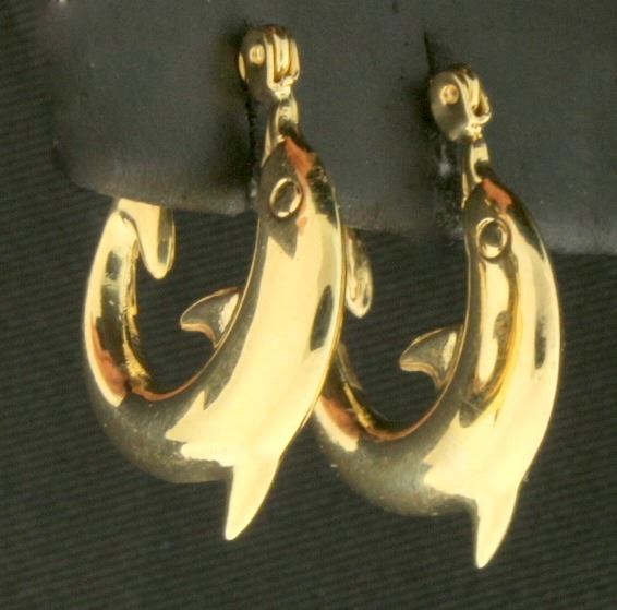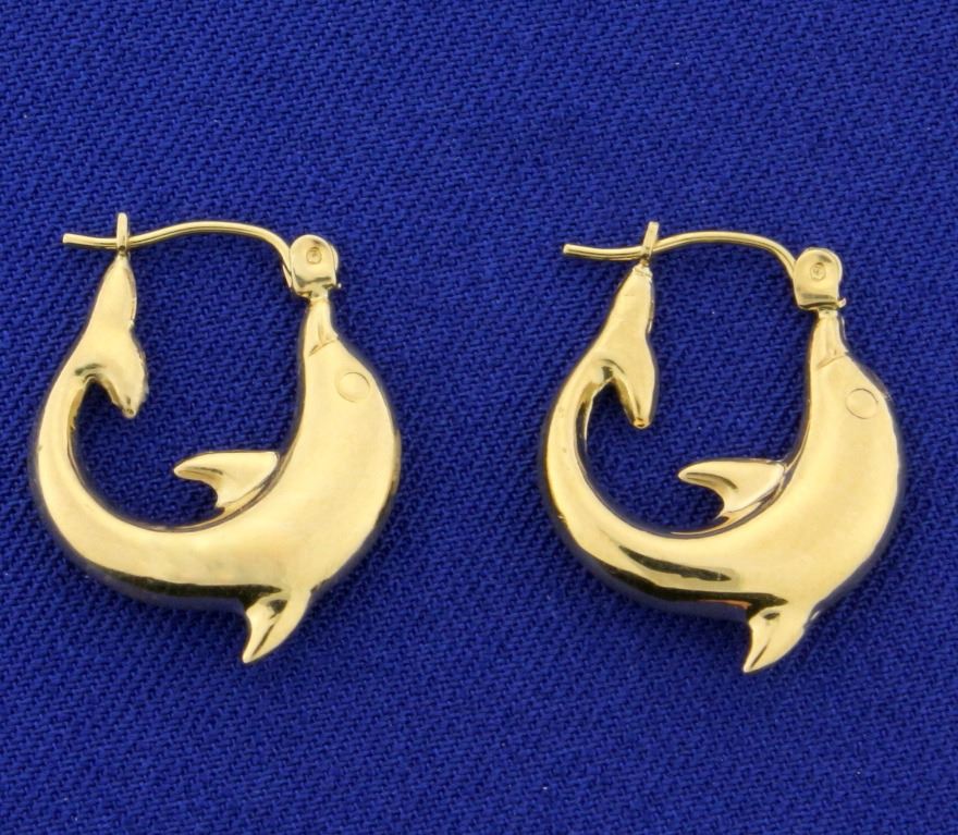 In 10k yellow gold. 7/8" long by 5/8" wide with lever backs. Very minor pin dent on side of one dolphin, not noticeable. 1.1g.