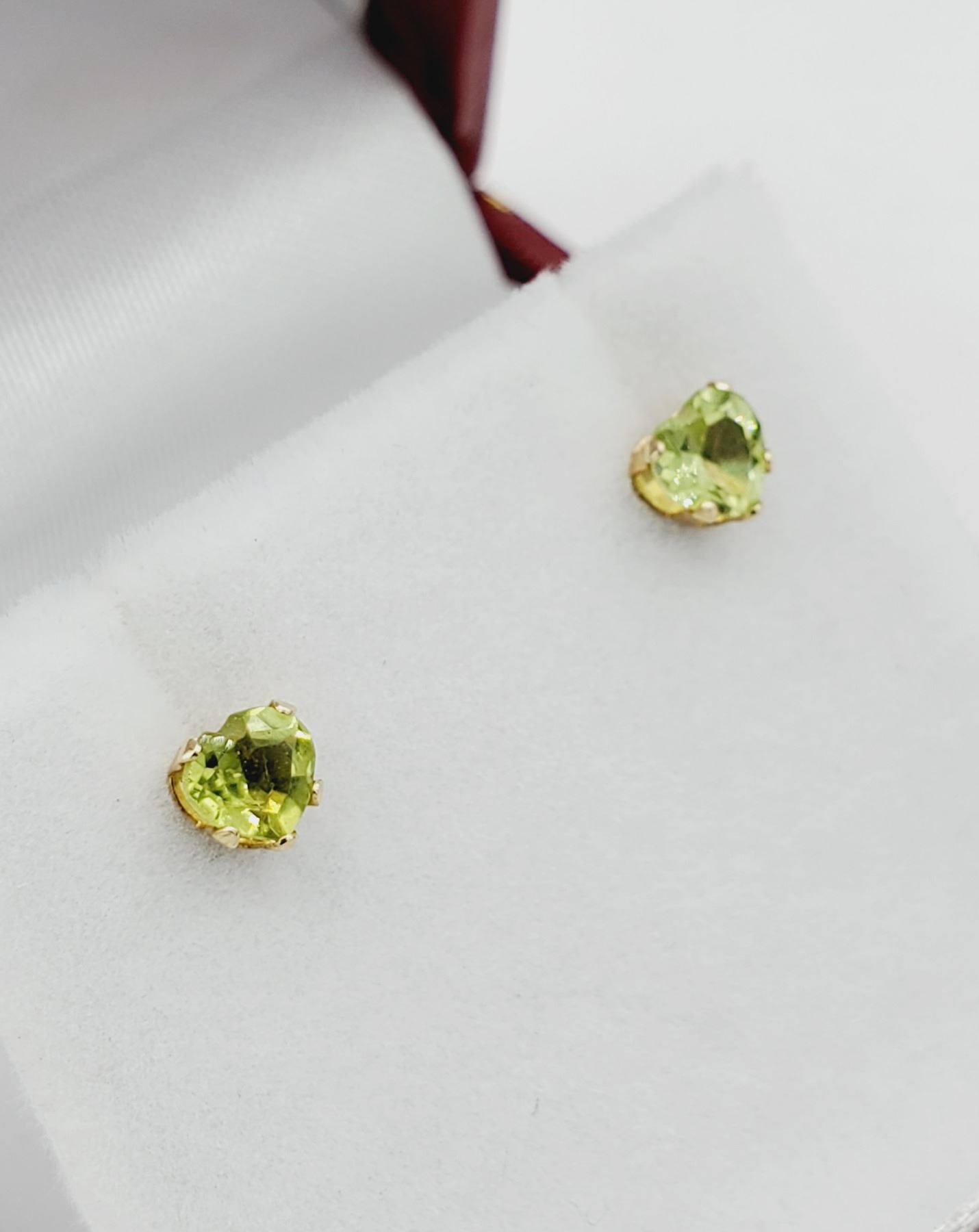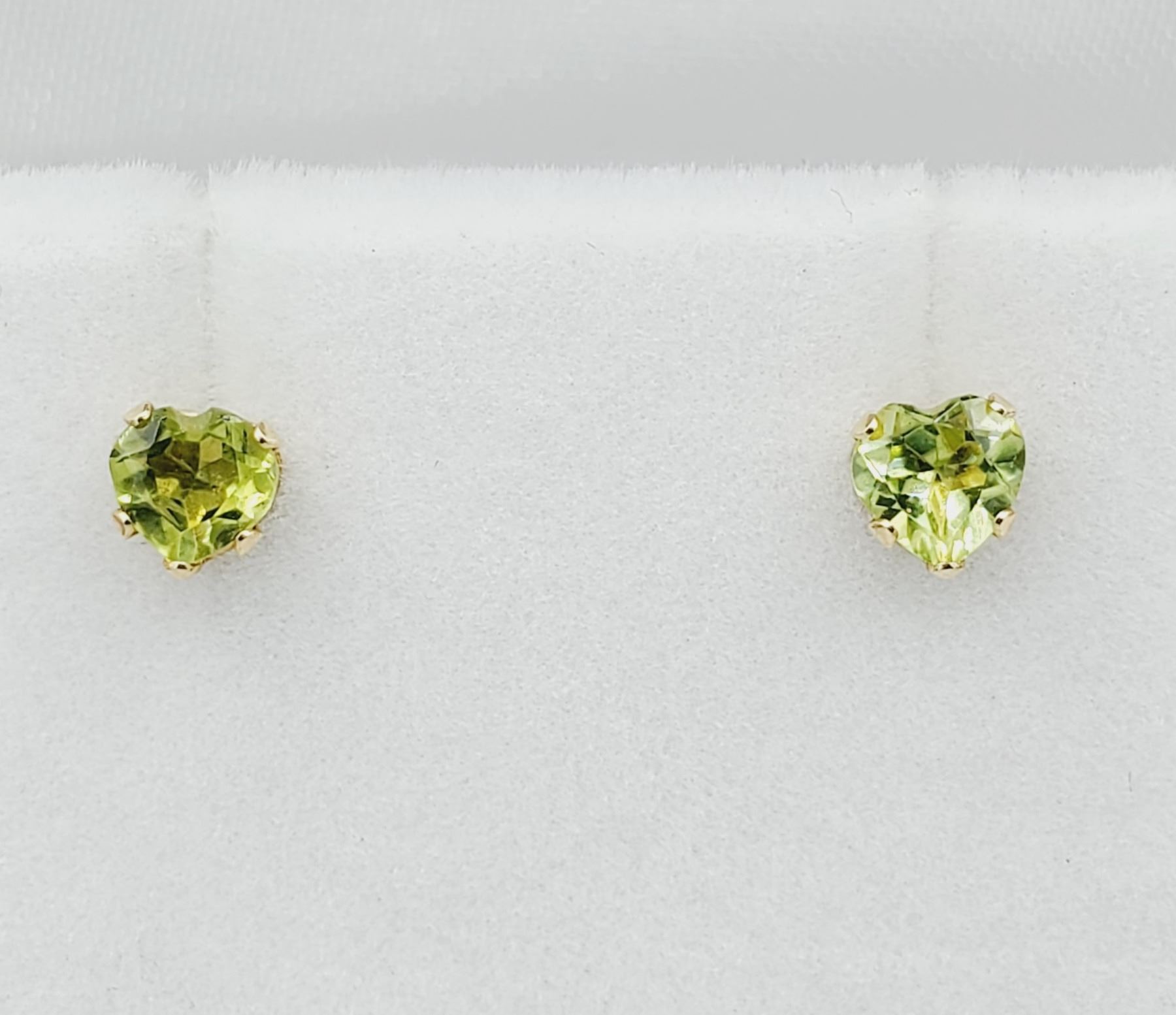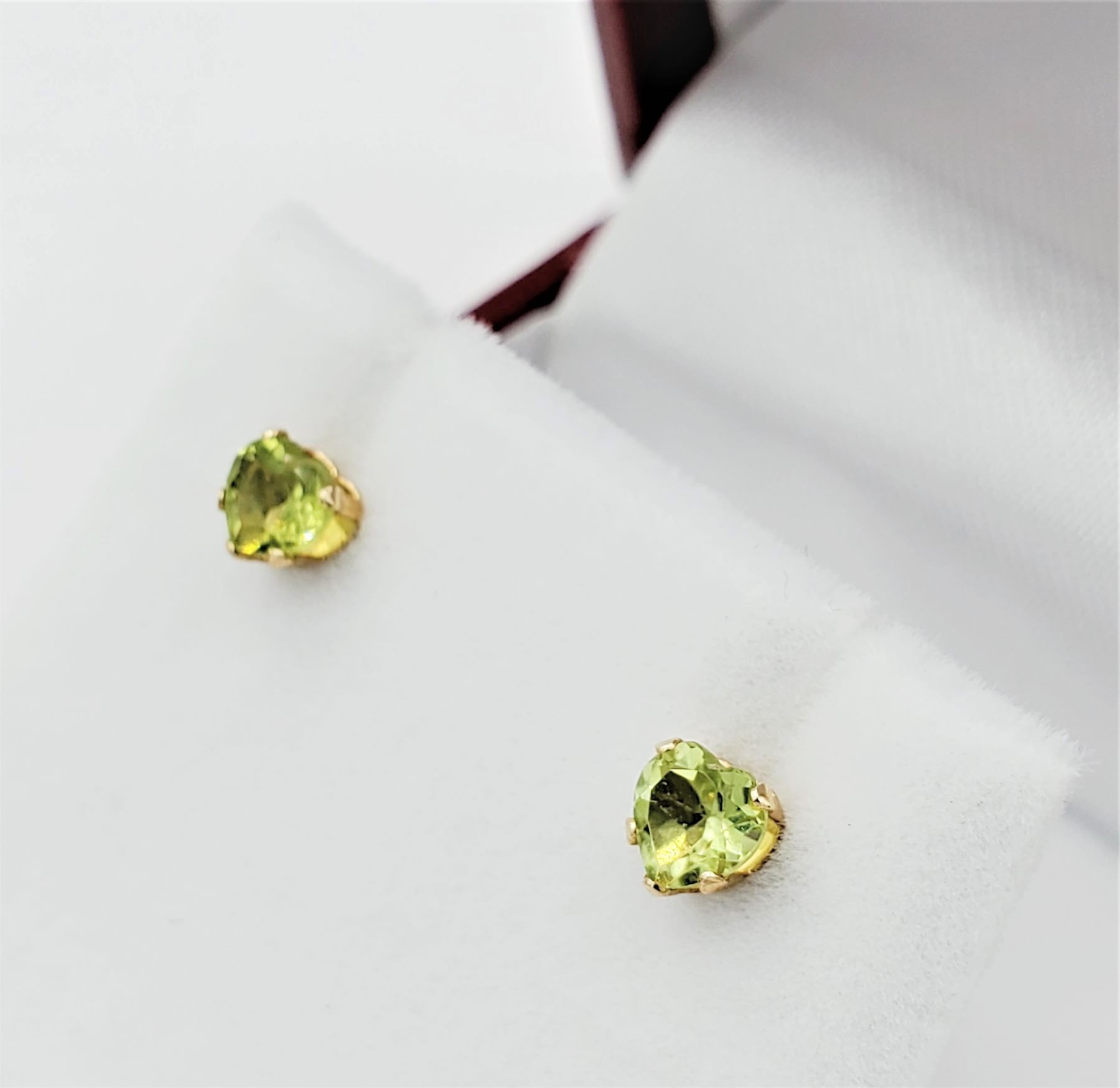 14kt. Yellow Gold 4mm x 4mm genuine Peridot heart Earrings, retail $300.00, Peridot is the birthstone for August.