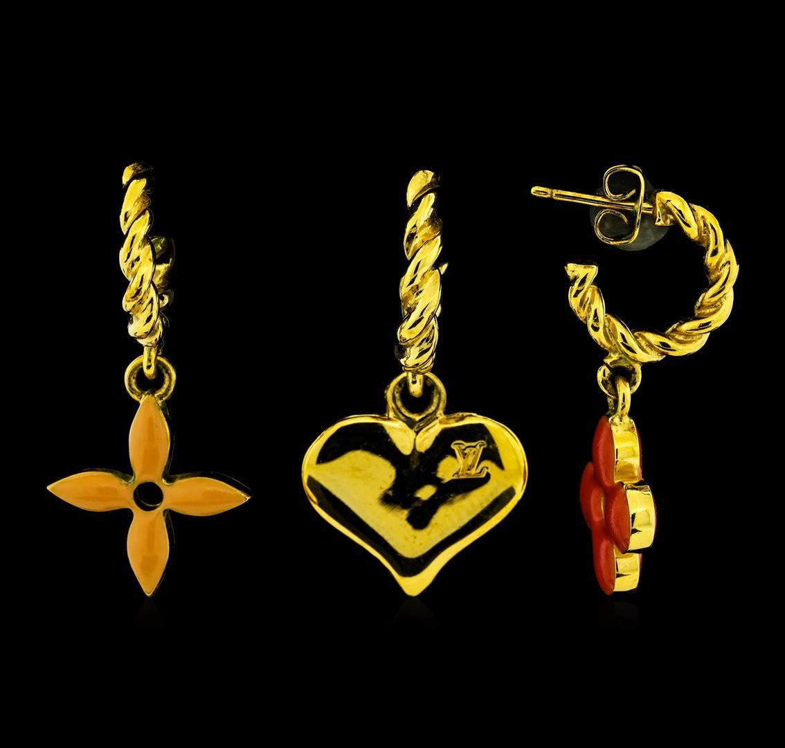One set of three Louis Vuttion Sweet Monogram earrings featuring enamel and gold plating.